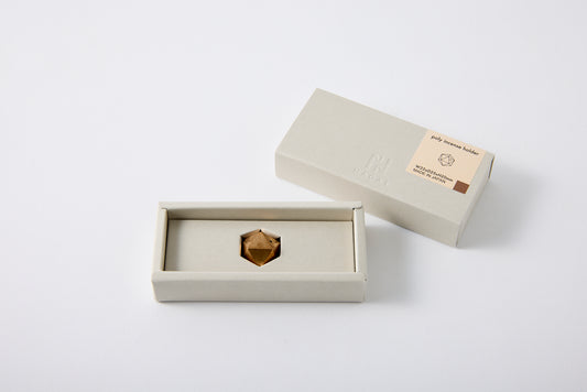 A geometric incense holder made of raw bronze or brass, compatible with both bamboo incenses and incense sticks. Designed as a regular icosahedron, it can be positioned at three angles depending on the incense length. The uncoated metal develops a rich patina over time.