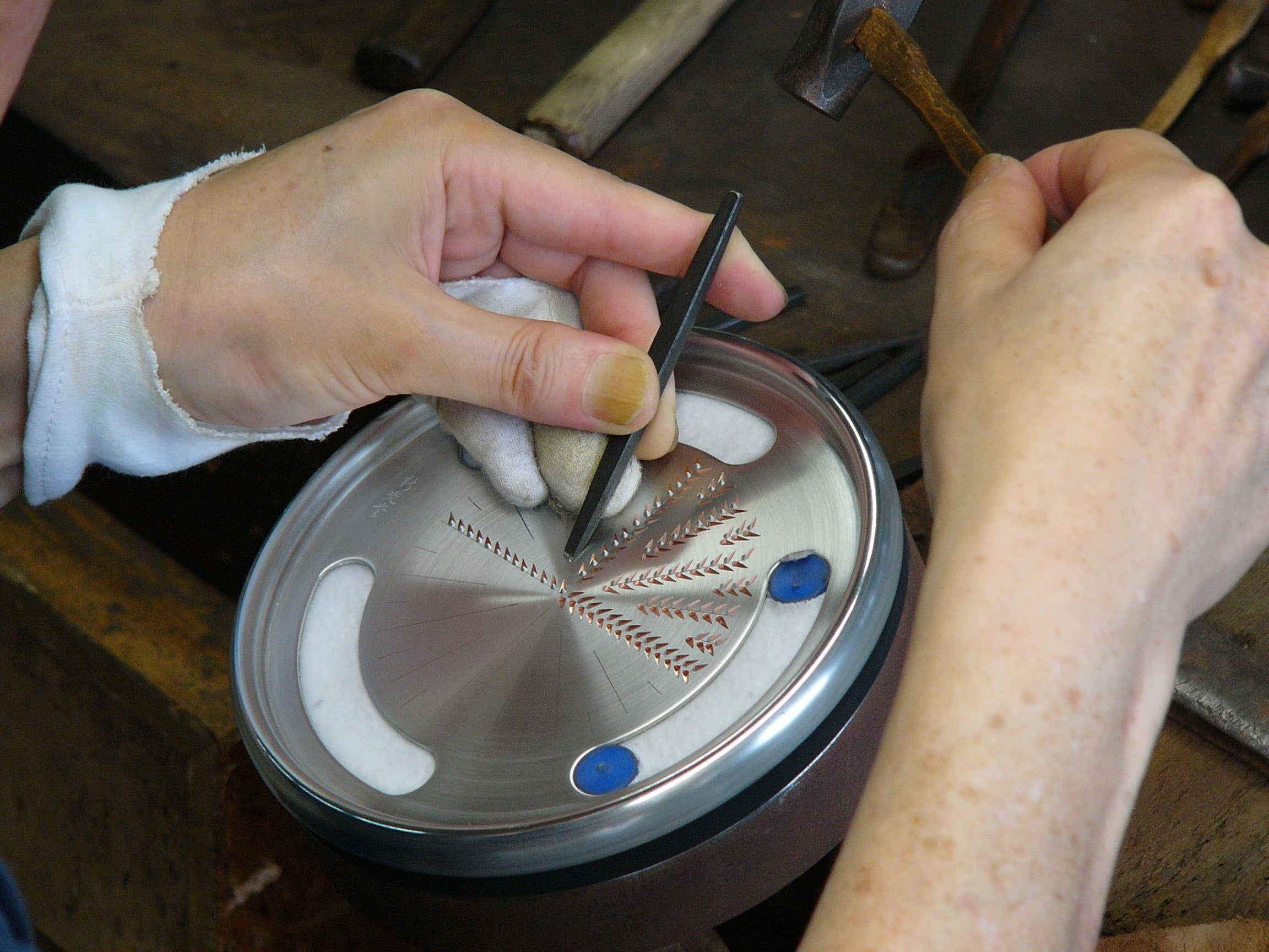 featuring artisans meticulously crafting each piece with traditional hammering techniques.