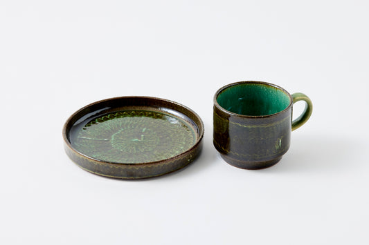 FD Green Glaze Bold Double Brush Stroke Coffee Cup & Saucer Hasami Porcelain