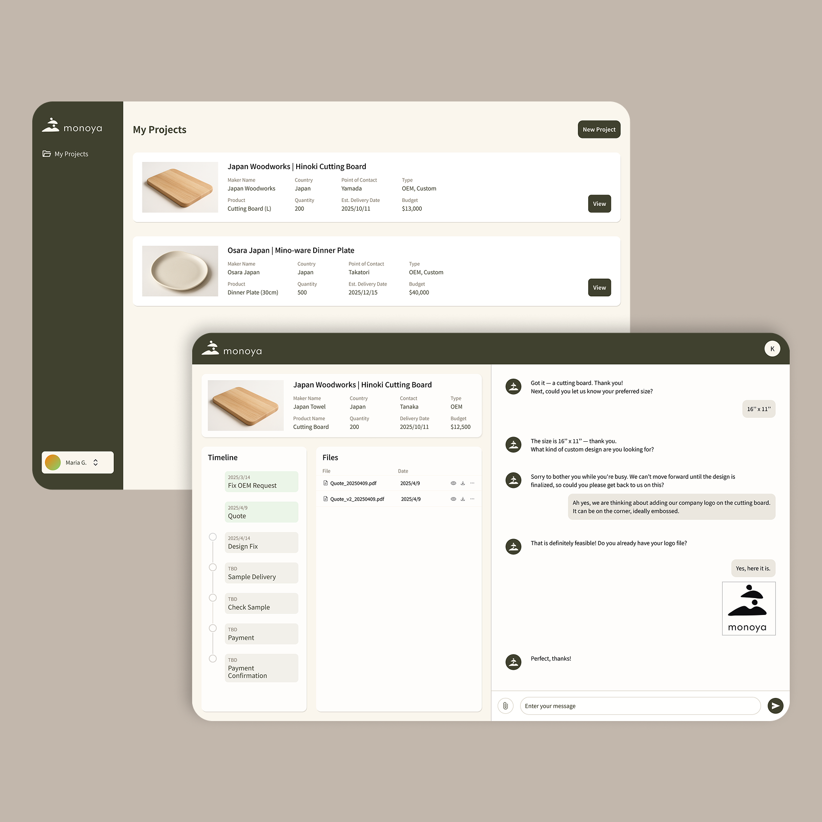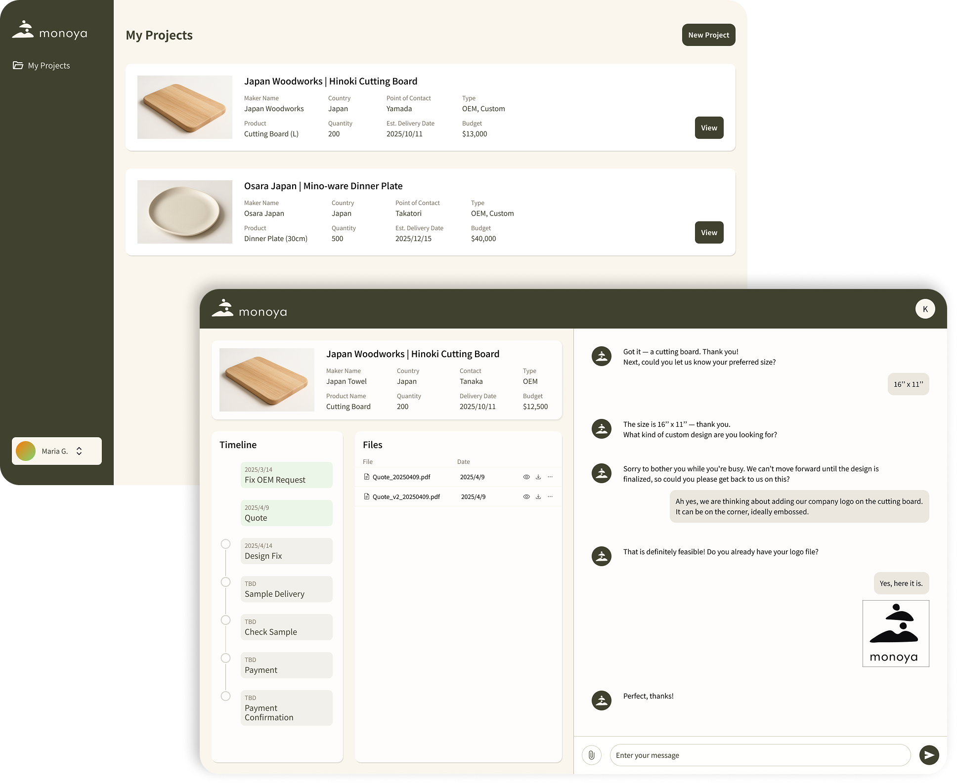 monoyaが海外・国内のブランドに営業し、受注可能なOEM案件を継続的に獲得します。