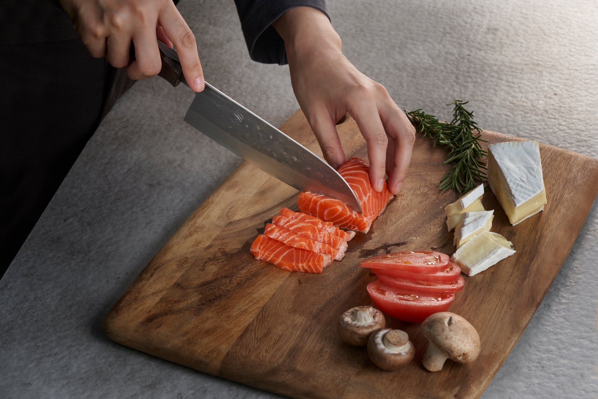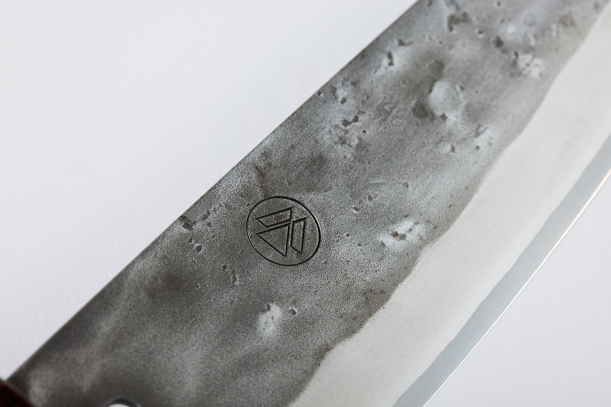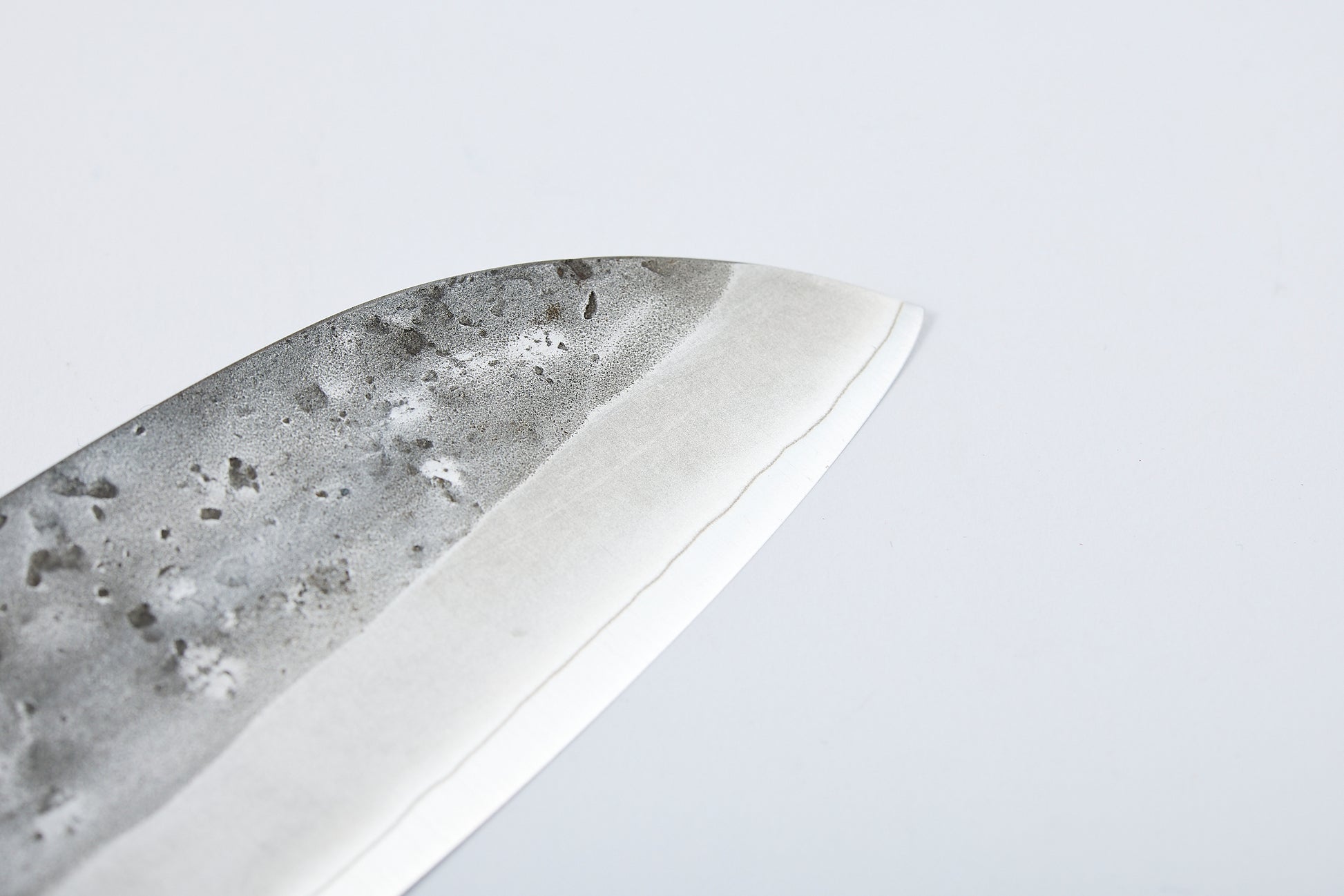 The handle of this knife has a distinctive textured surface. This is achieved through a traditional Japanese hammering technique called "naguri-kakou." It not only provides a better grip but also adds a beautiful visual element to the knife.