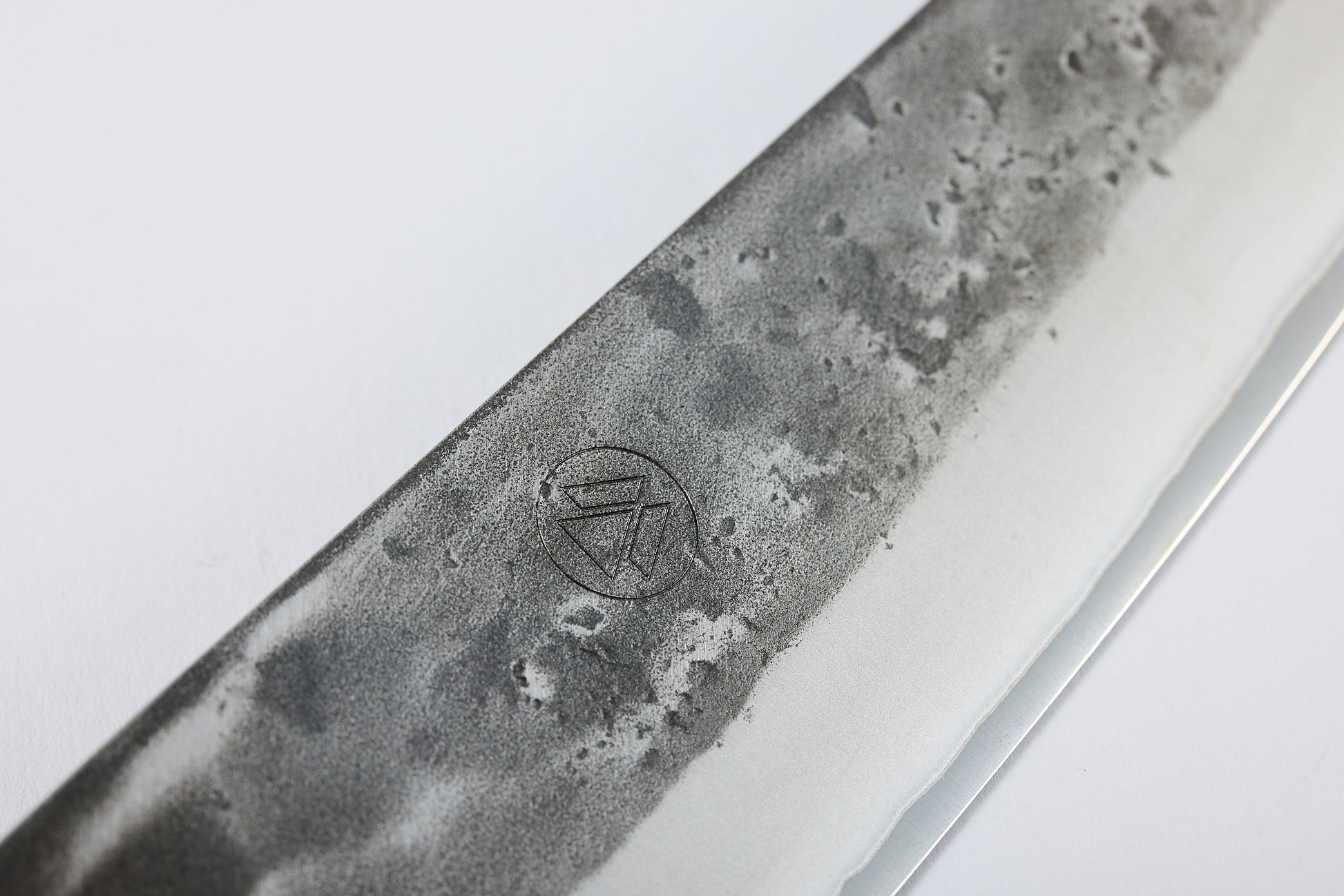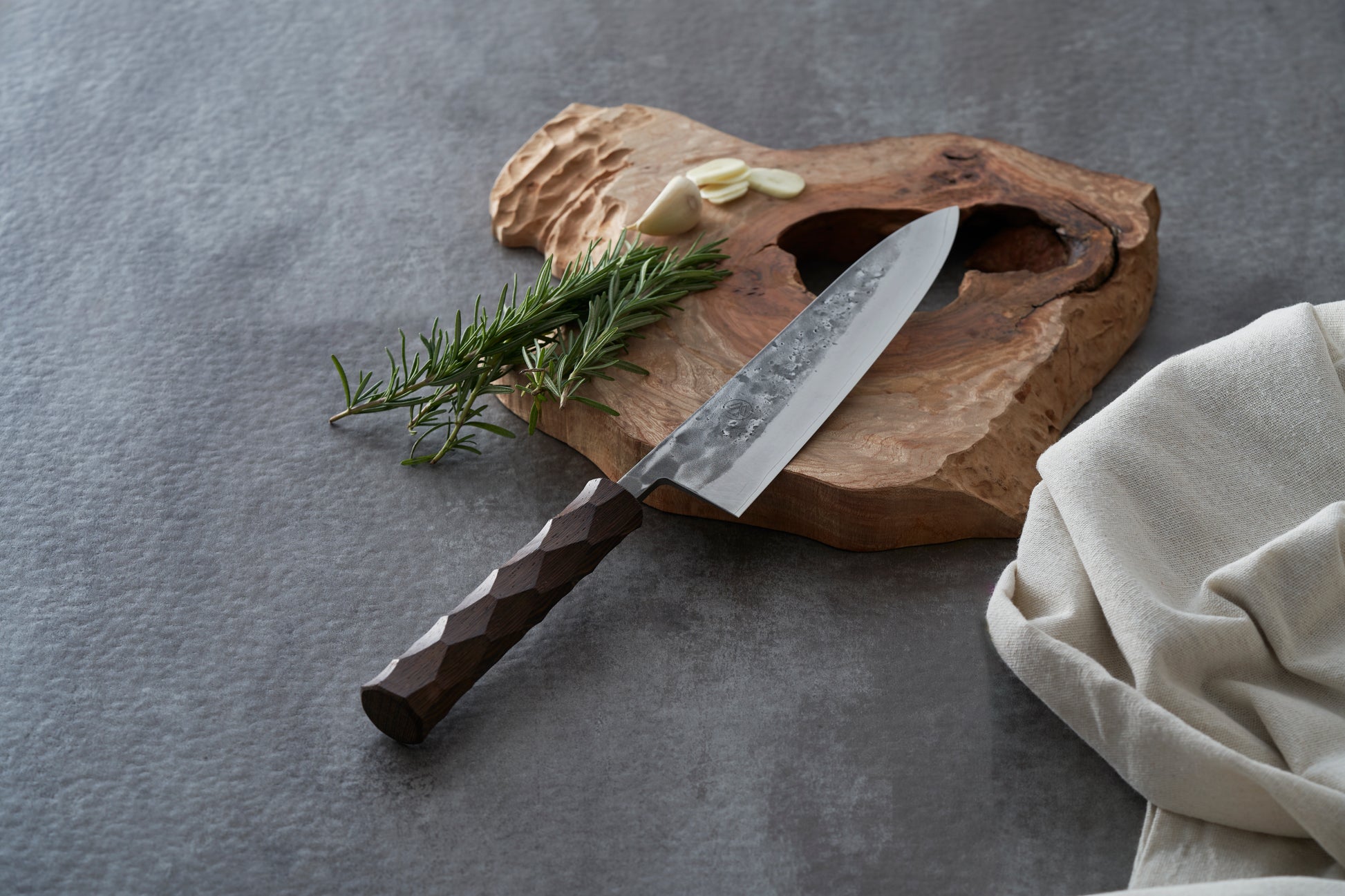 The handle of this knife has a distinctive textured surface. This is achieved through a traditional Japanese hammering technique called "Naguri-kakou." It not only provides a better grip but also adds a beautiful visual element to the knife.