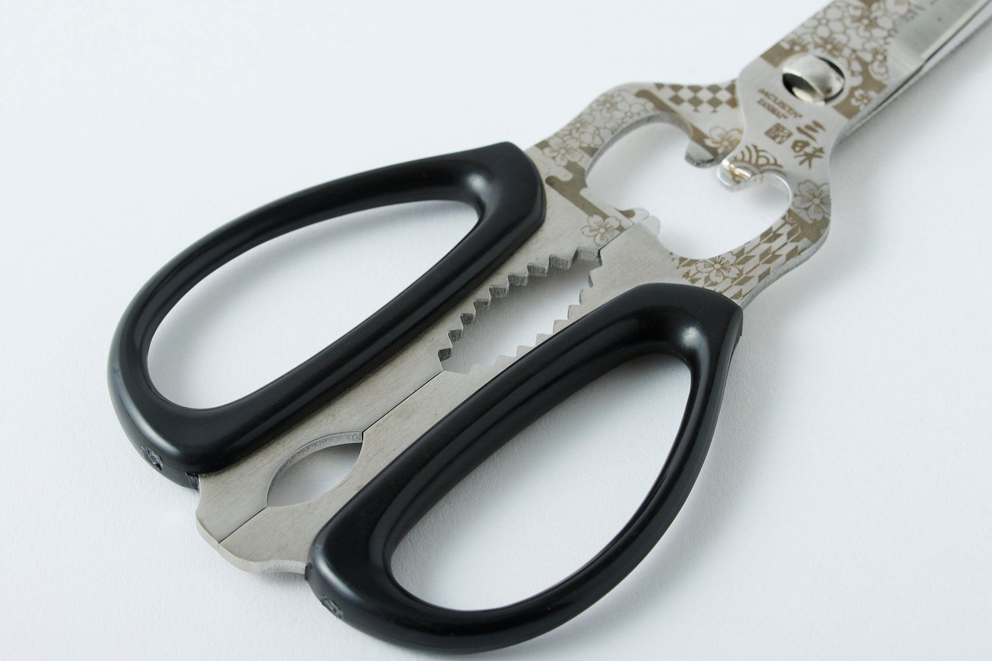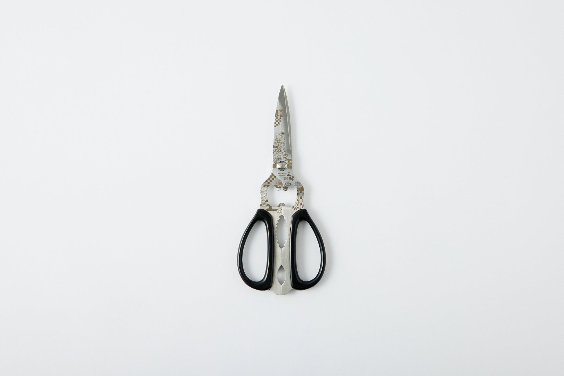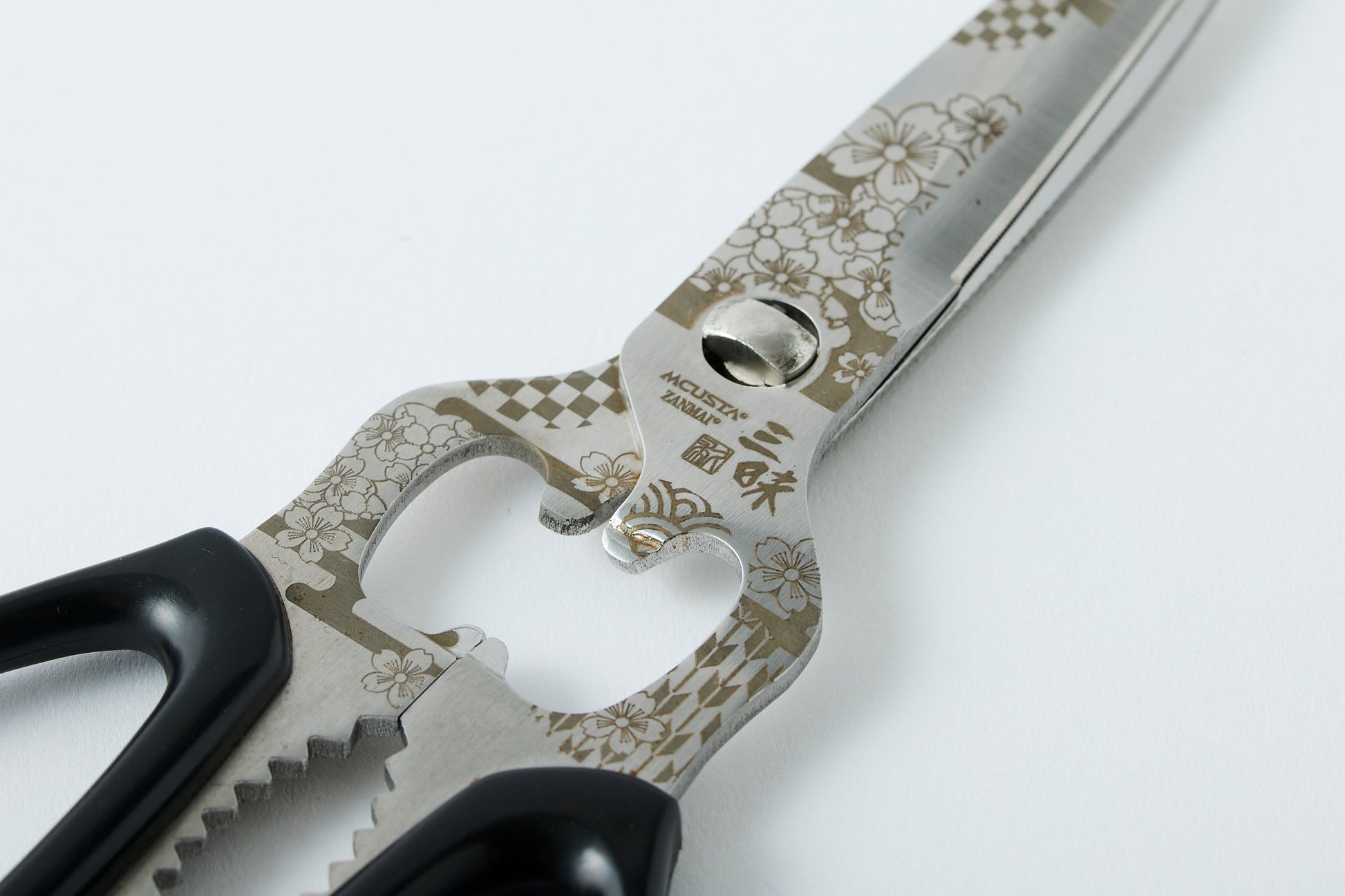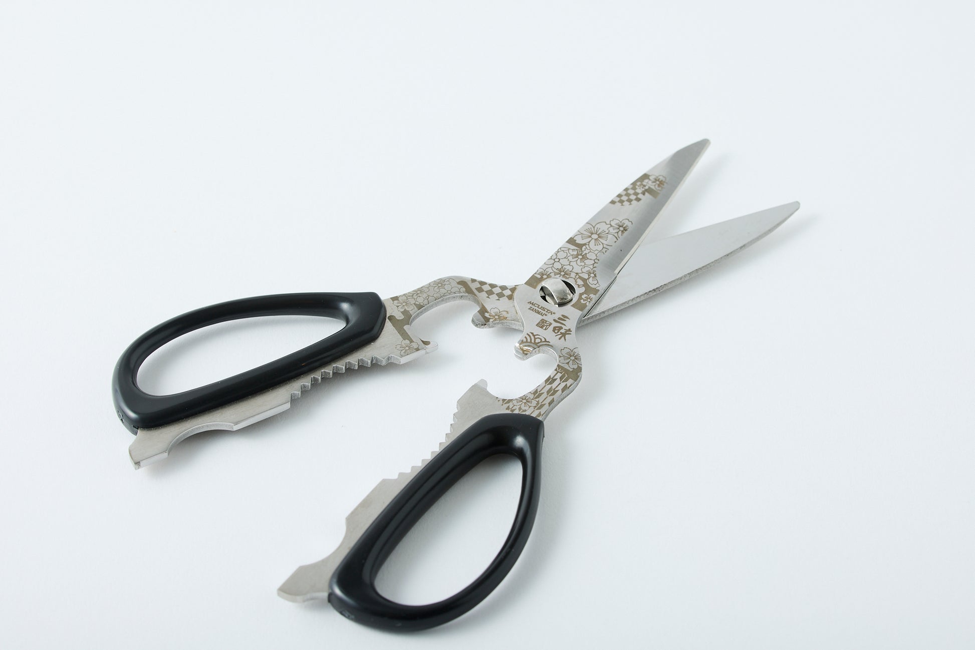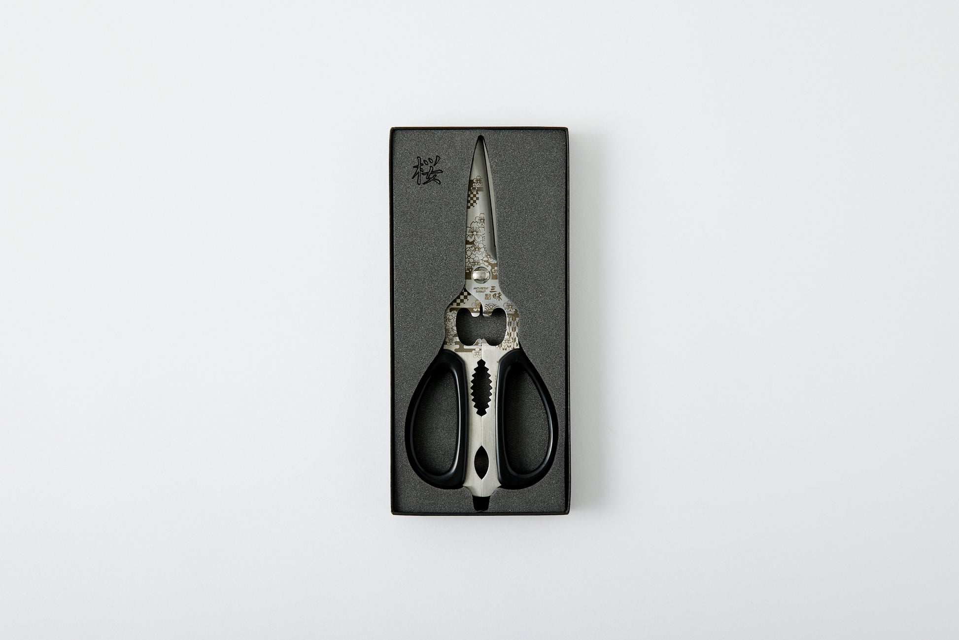 These scissors are made in Seki City, Gifu Prefecture, Japan, which is famous for its high-quality blades. They feature a cherry blossom marking and are designed for various uses.