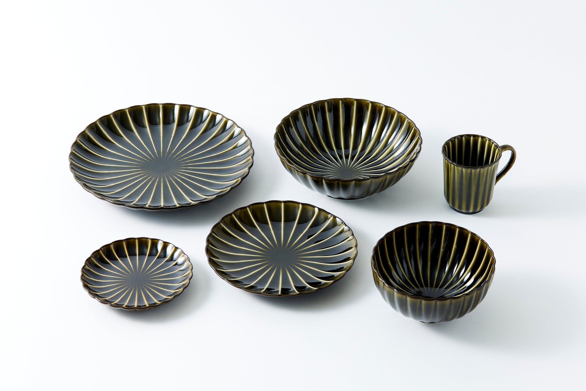 A depth like layered lacquer and delicate transparency akin to glass. Named after "giyaman," a term used in the Edo period to mean glassware. With an overwhelming presence, it brings an elevated elegance, akin to a high-end restaurant, to any dish. Microwave and dishwasher safe, it is also highly practical. The Oribe glaze, a tradition of Mino ware, is given a modern twist, showcasing a deep green hue reminiscent of the matcha tea that pools at the bottom of a tea bowl. It humbly carries the name of Sen no Rikyū, the father of the tea ceremony. Particularly striking with yellow dishes or ingredients, it enhances meals whether for everyday use or special occasions, elevating the presentation of your cuisine.