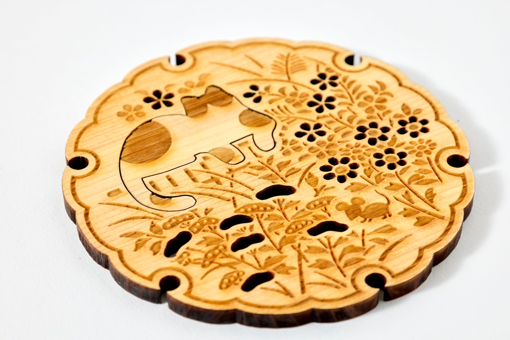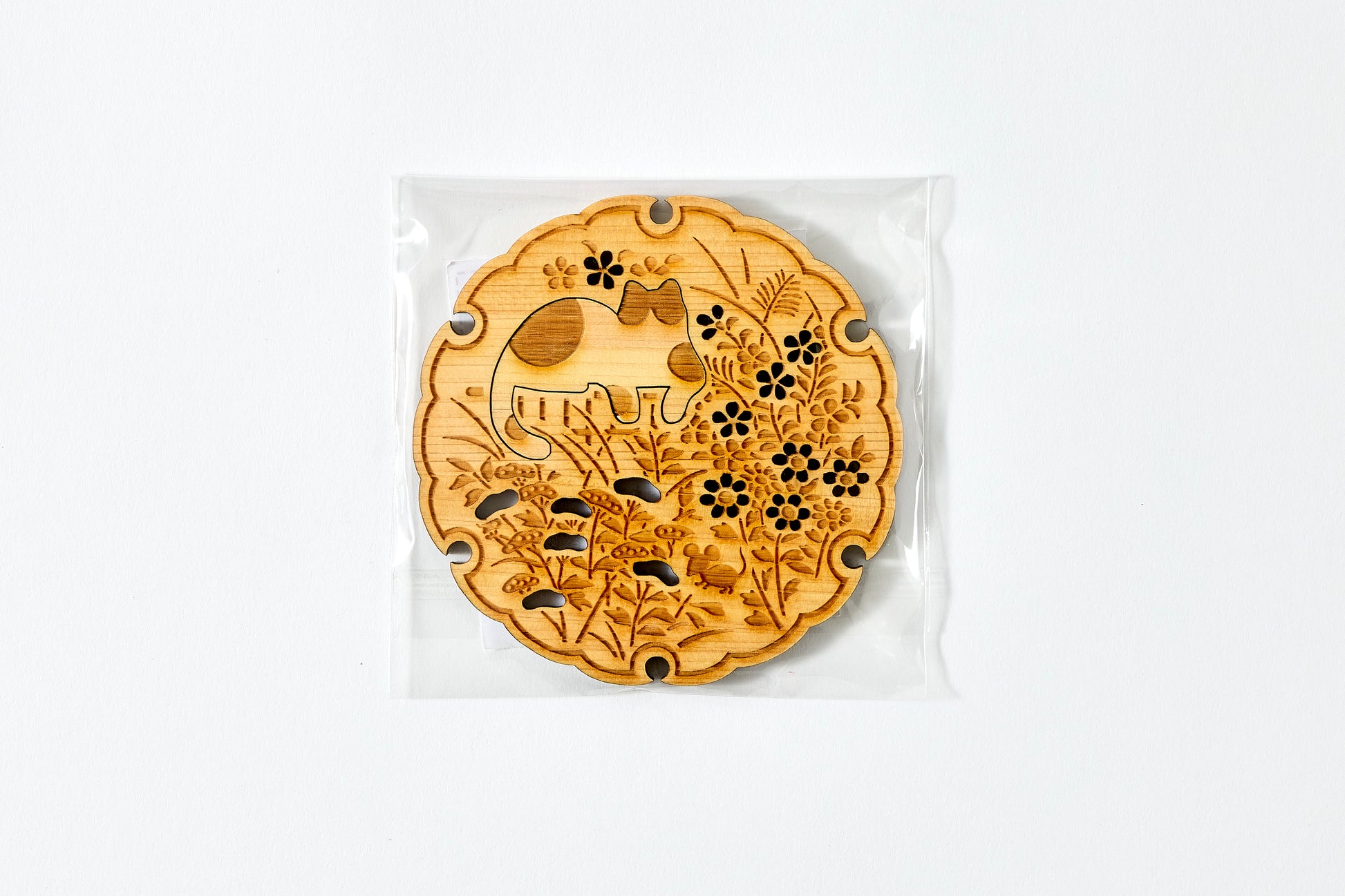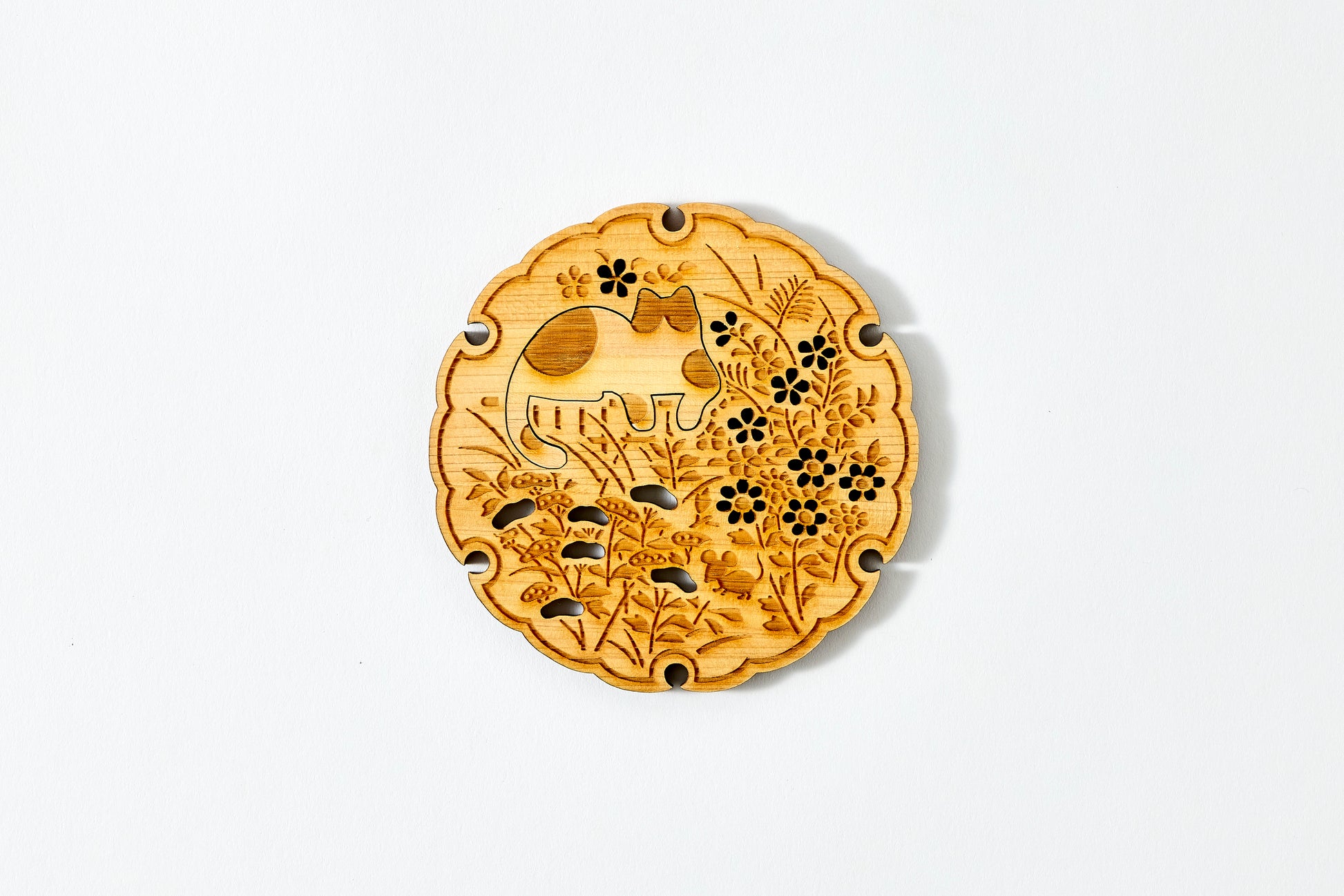 Laser-cut into the traditional yukiwa (snow ring) shape—symbolizing prosperity—this piece features a charming hachiware (tuxedo cat) intently watching a tiny mouse hidden among delicate flowers, intricately expressed through laser engraving.