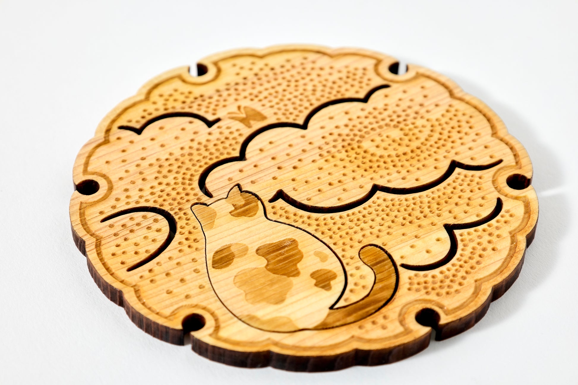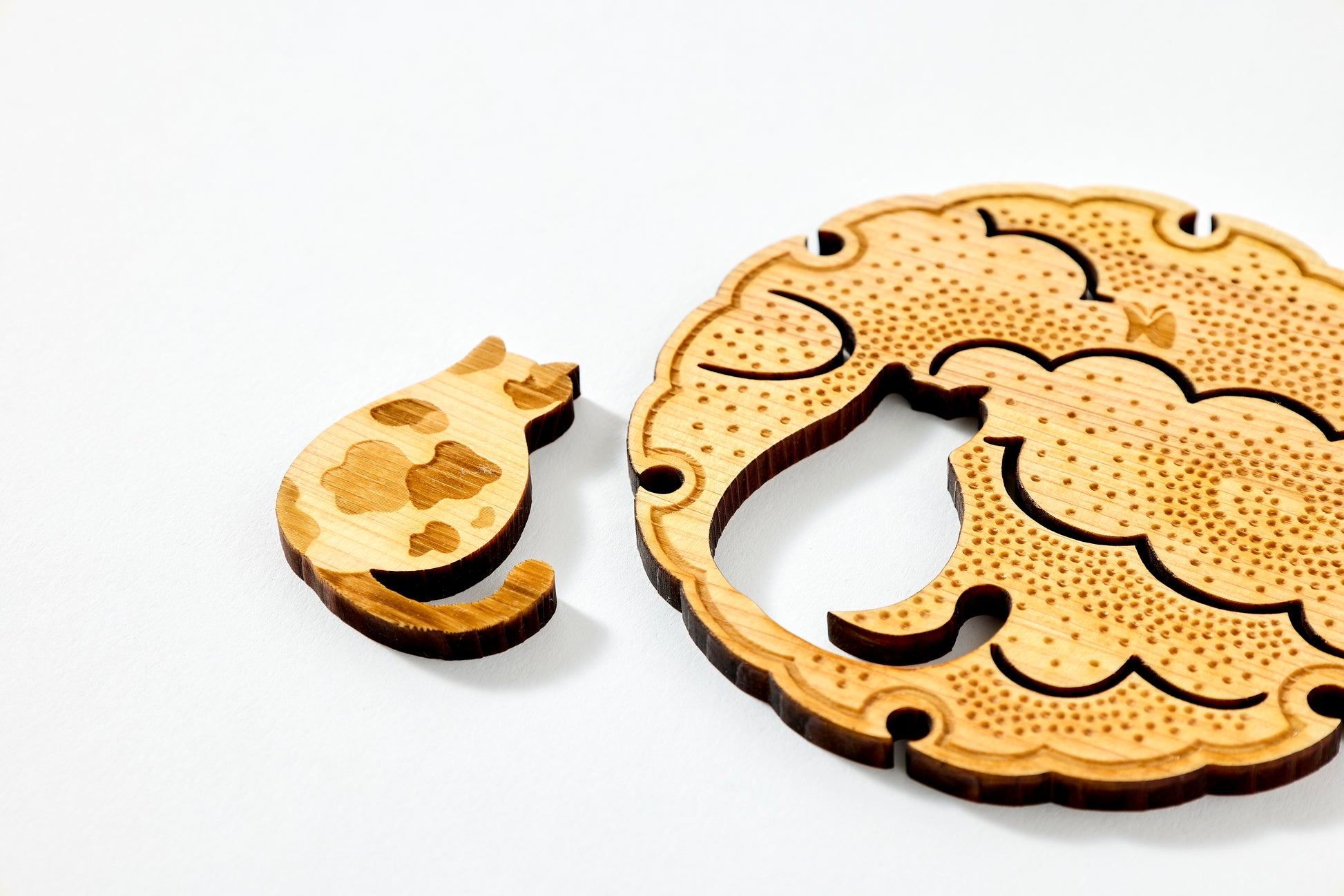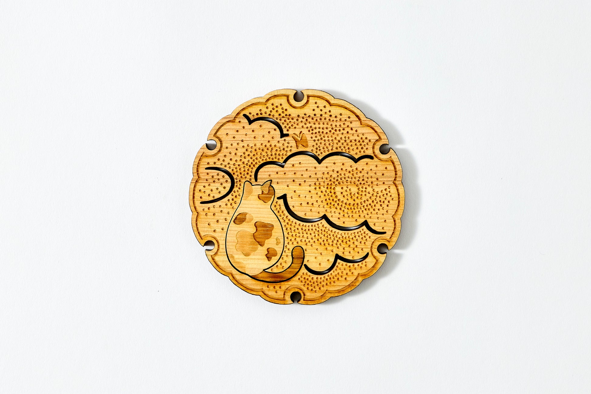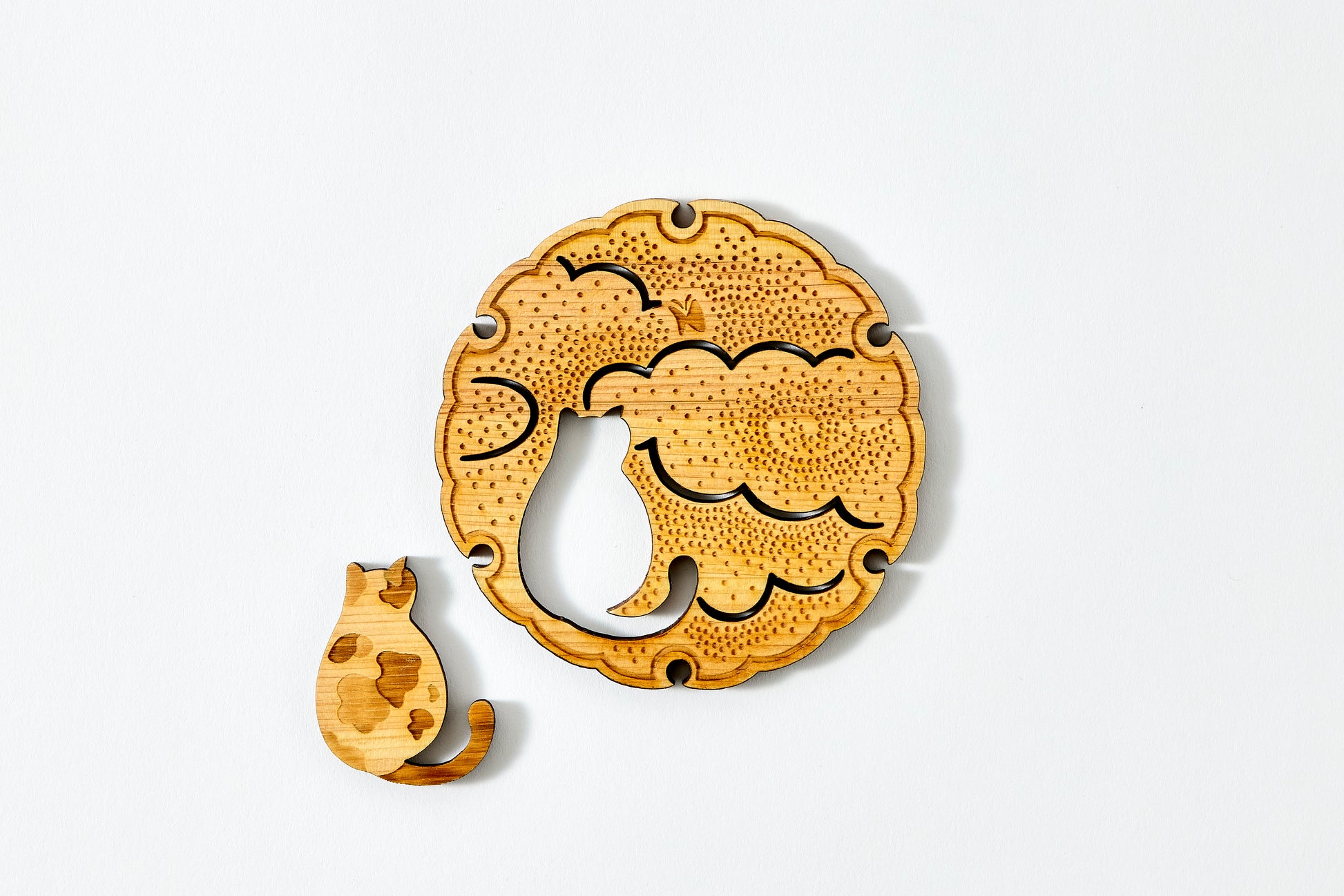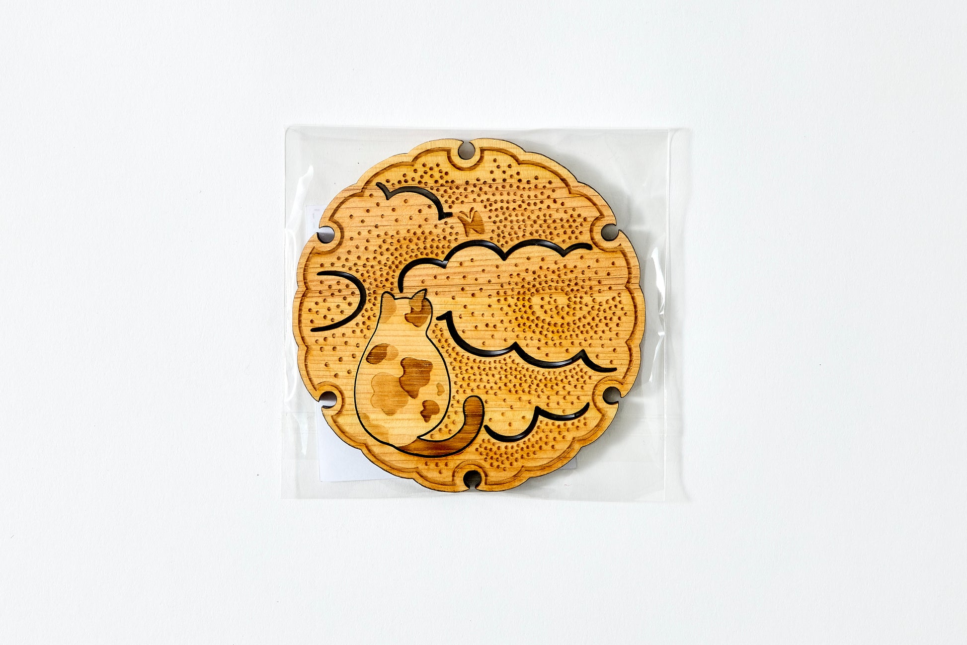 Laser-cut in the traditional yukiwa (snow ring) shape, which symbolizes prosperity, this piece captures a whimsical scene of a calico cat gazing up at a butterfly in flight—beautifully rendered through detailed laser engraving.