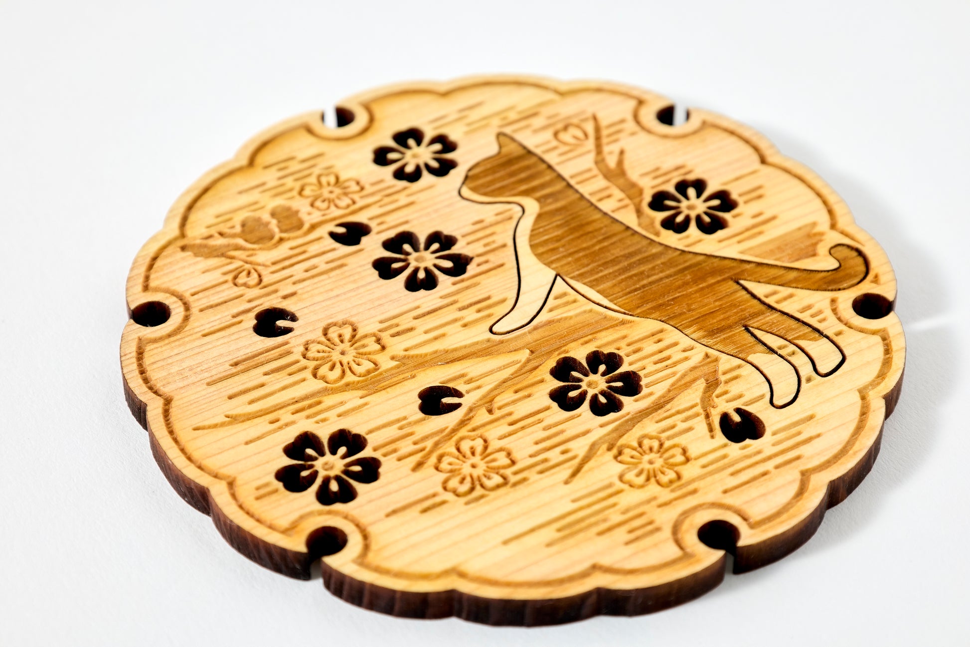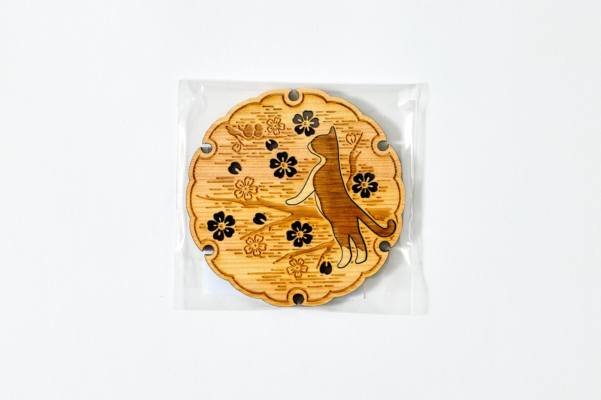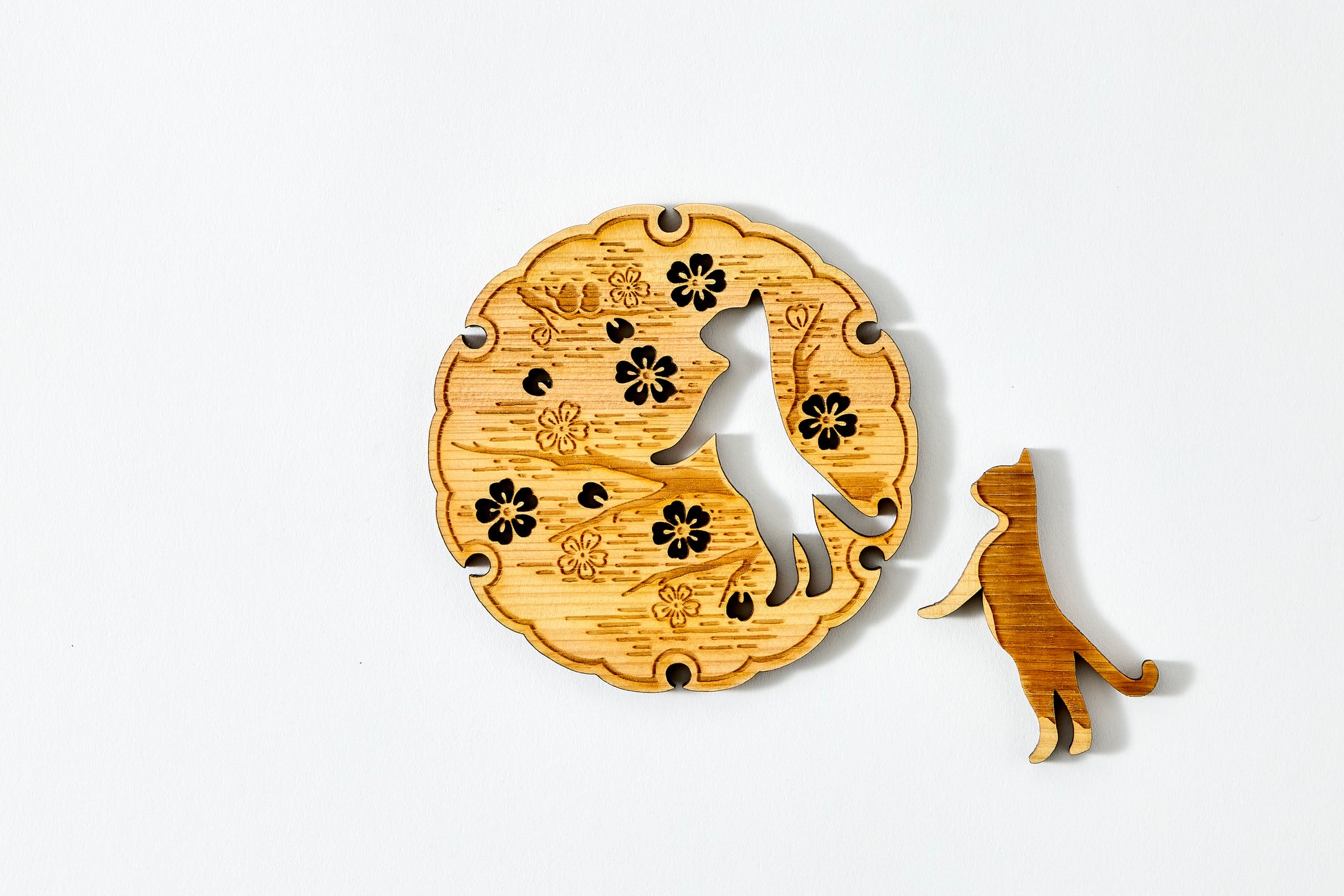 Laser-cut in the traditional yukiwa (snow ring) shape—symbolizing prosperity—this piece features a stylish hachiware (tuxedo cat) captured in a whimsical moment, as if conversing with a bird perched on a cherry blossom tree. The scene is delicately brought to life through fine laser engraving.