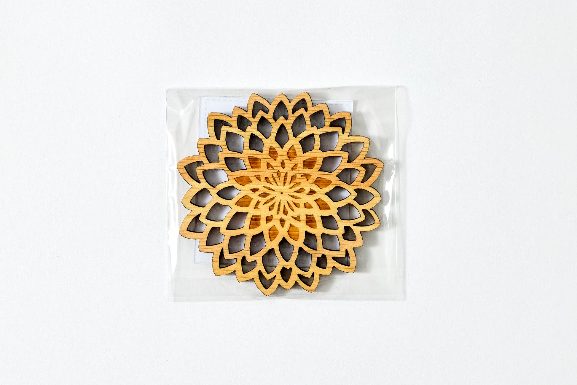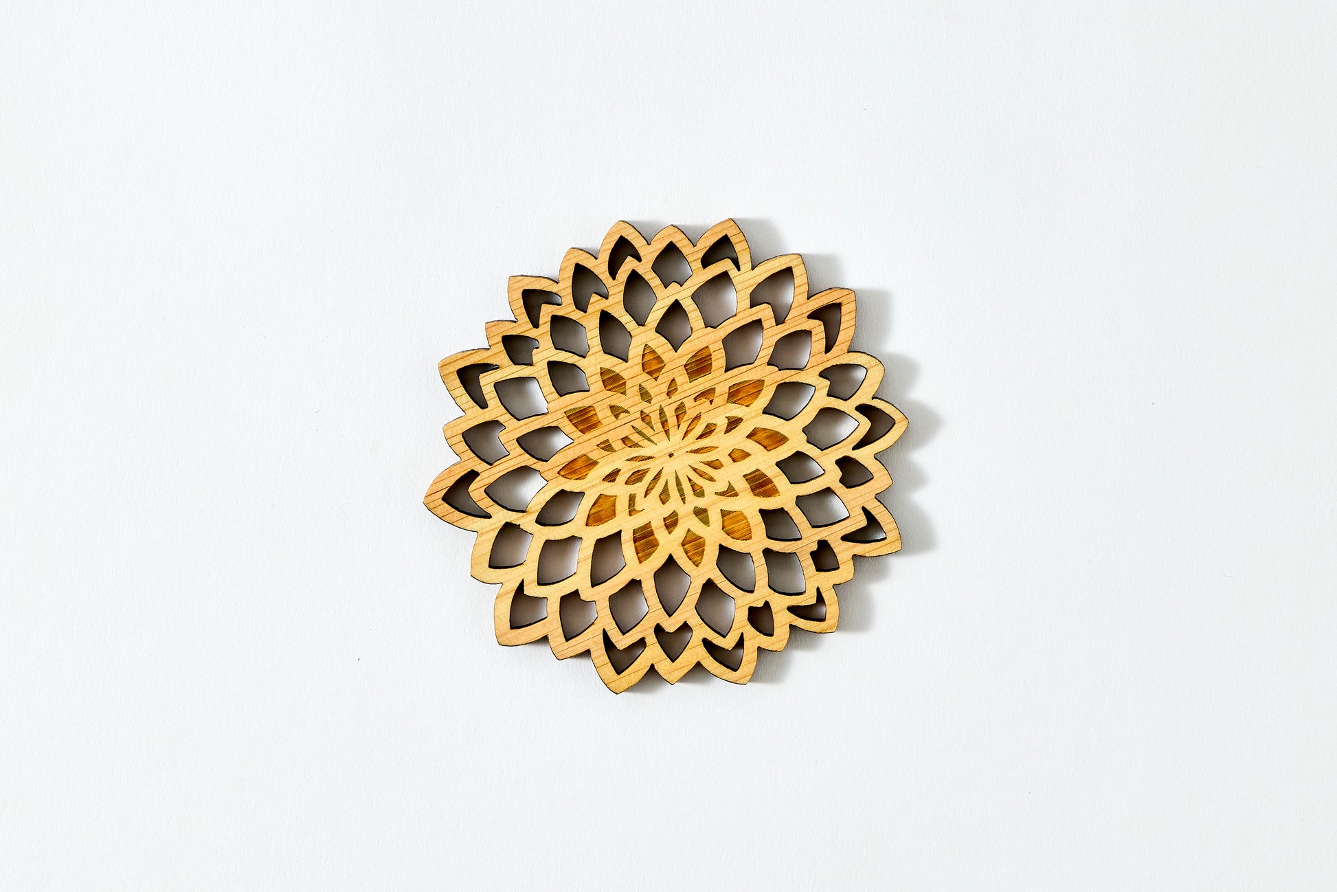 A wooden coaster adorned with a chrysanthemum motif, bringing the timeless beauty of this iconic flower into your everyday life.