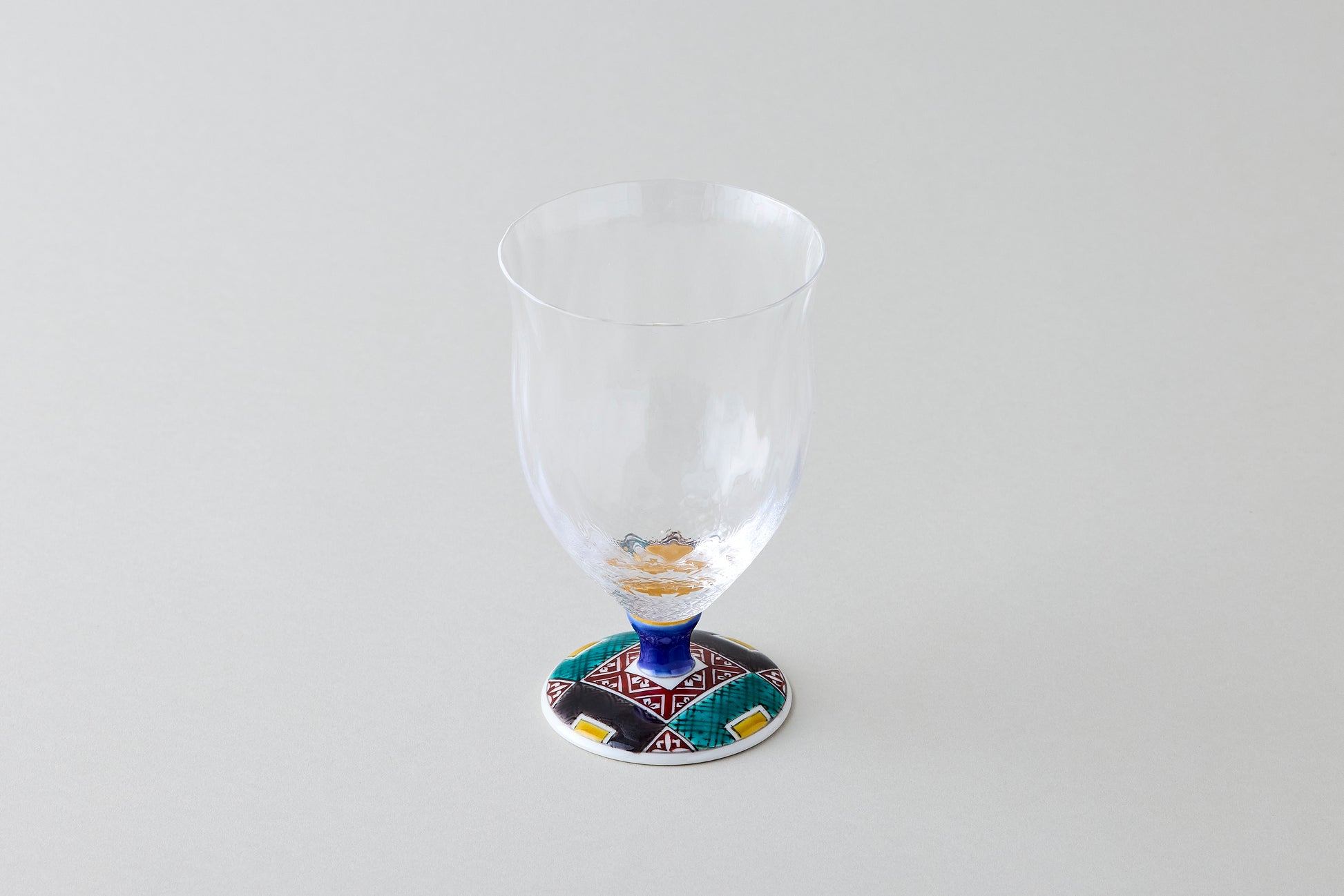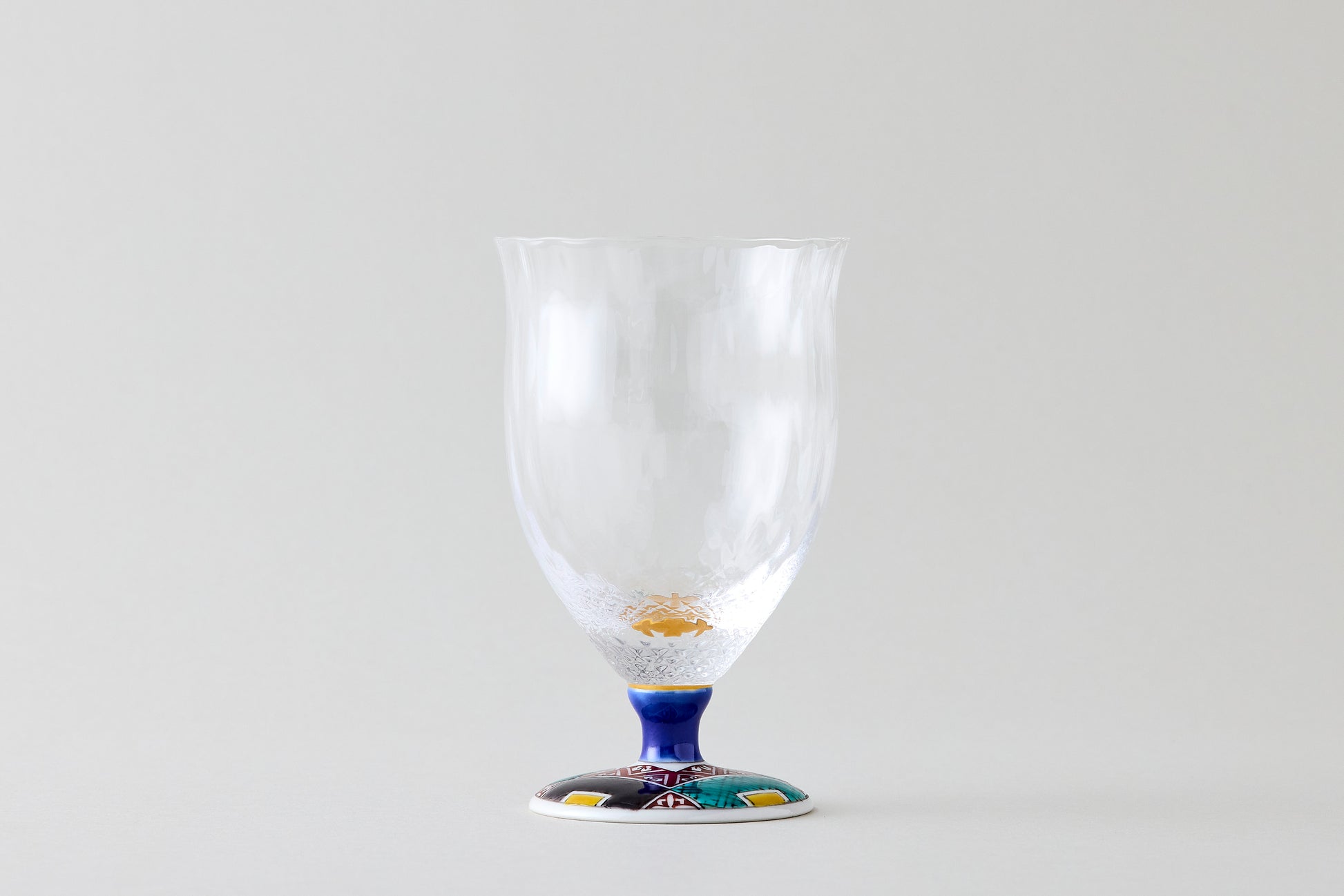 This is a medium-sized free glass from the "Kutani Wa Glass" series, created by fusing Kutani porcelain and handmade blown glass. With a capacity of approximately 280ml, it is perfect for a variety of iced drinks. It incorporates the "Ishidatami" (stone pavement) pattern, one of the representative designs of Ko-Kutani porcelain, vividly depicted using the five traditional colors of blue, yellow, red, purple, and navy blue.