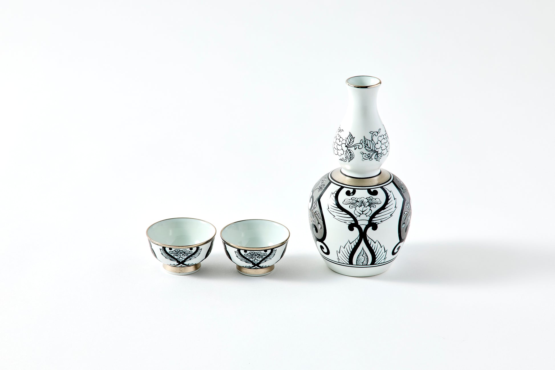 Whether for one or two, this sakeware set elevates the experience of drinking at home. It features a traditional Ko-Imari floral pattern expressed in black and platinum.