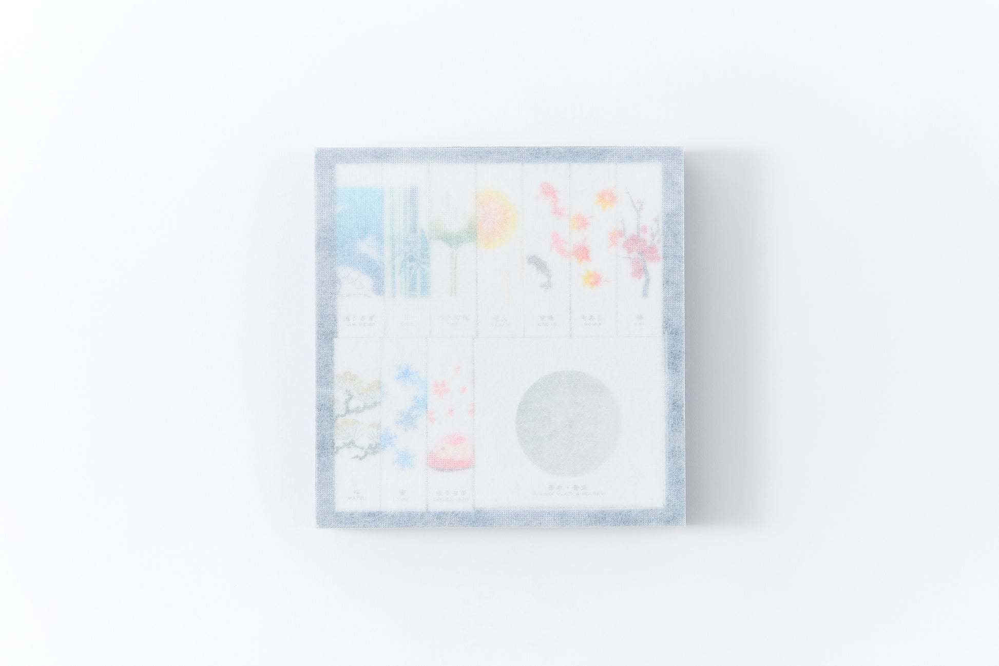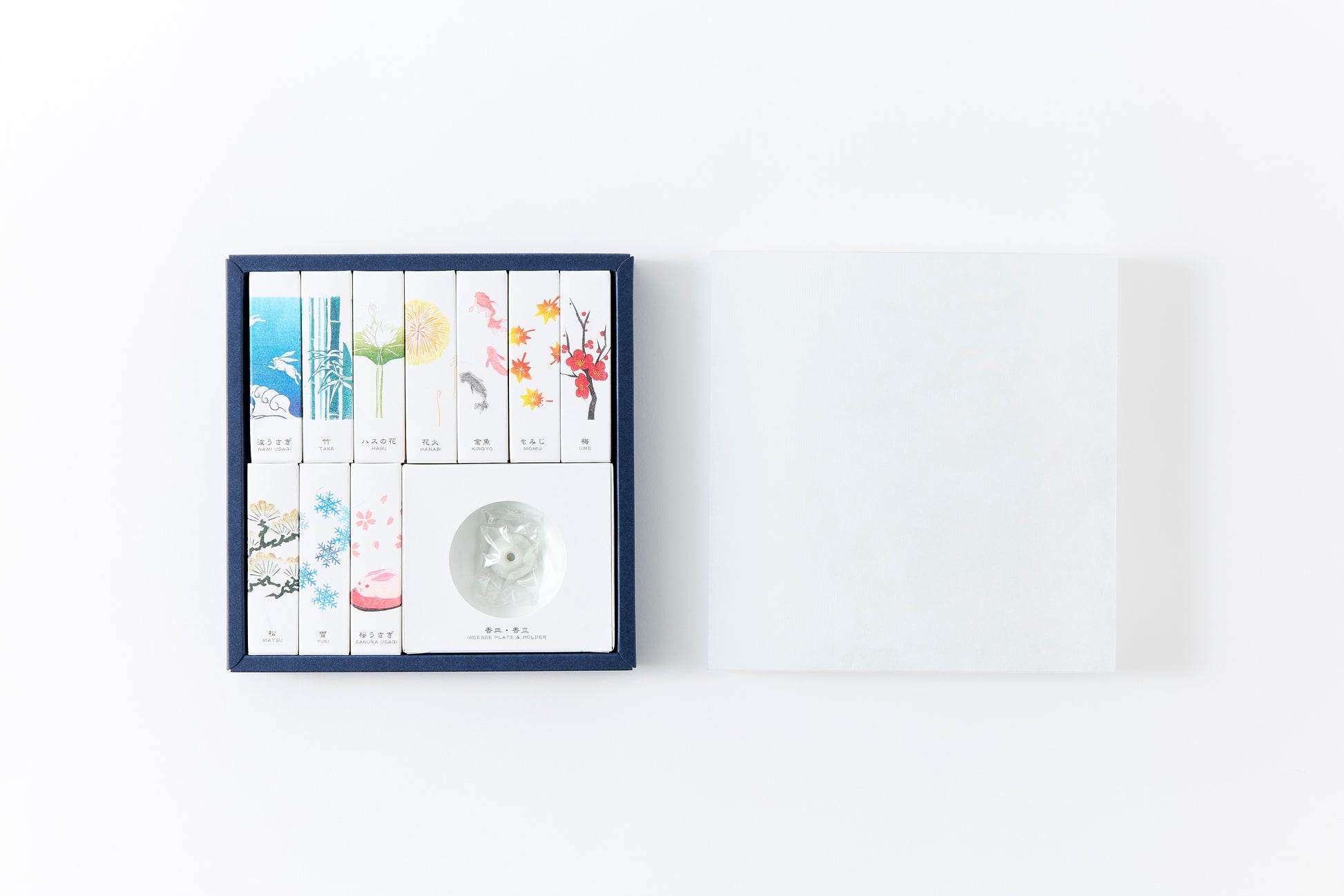 We have expressed Japan's beautiful four seasons through woodblock print-style packaging and fragrances. The "HANGA Incense Assortment" includes an incense holder and 10 different scents, making it ideal for discovering your favorite fragrance or as a gift.