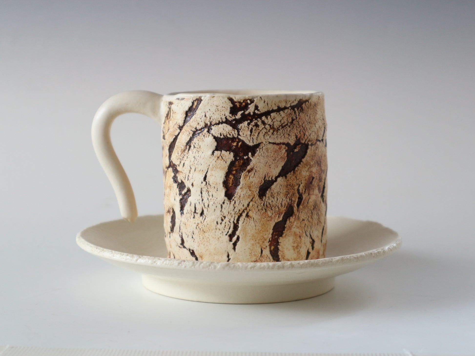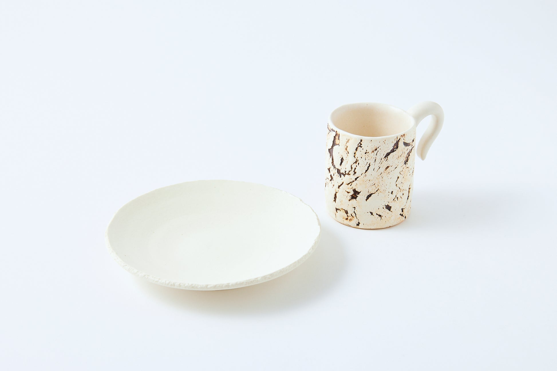 The works are characterized by rock-like surfaces and monotone colors. The material is semi-porcelain (a mix of clay and porcelain).It looks like a rock and feels heavy, but when you actually hold it, it is light and strong.