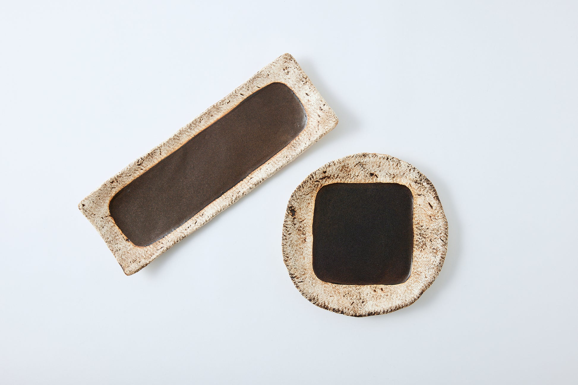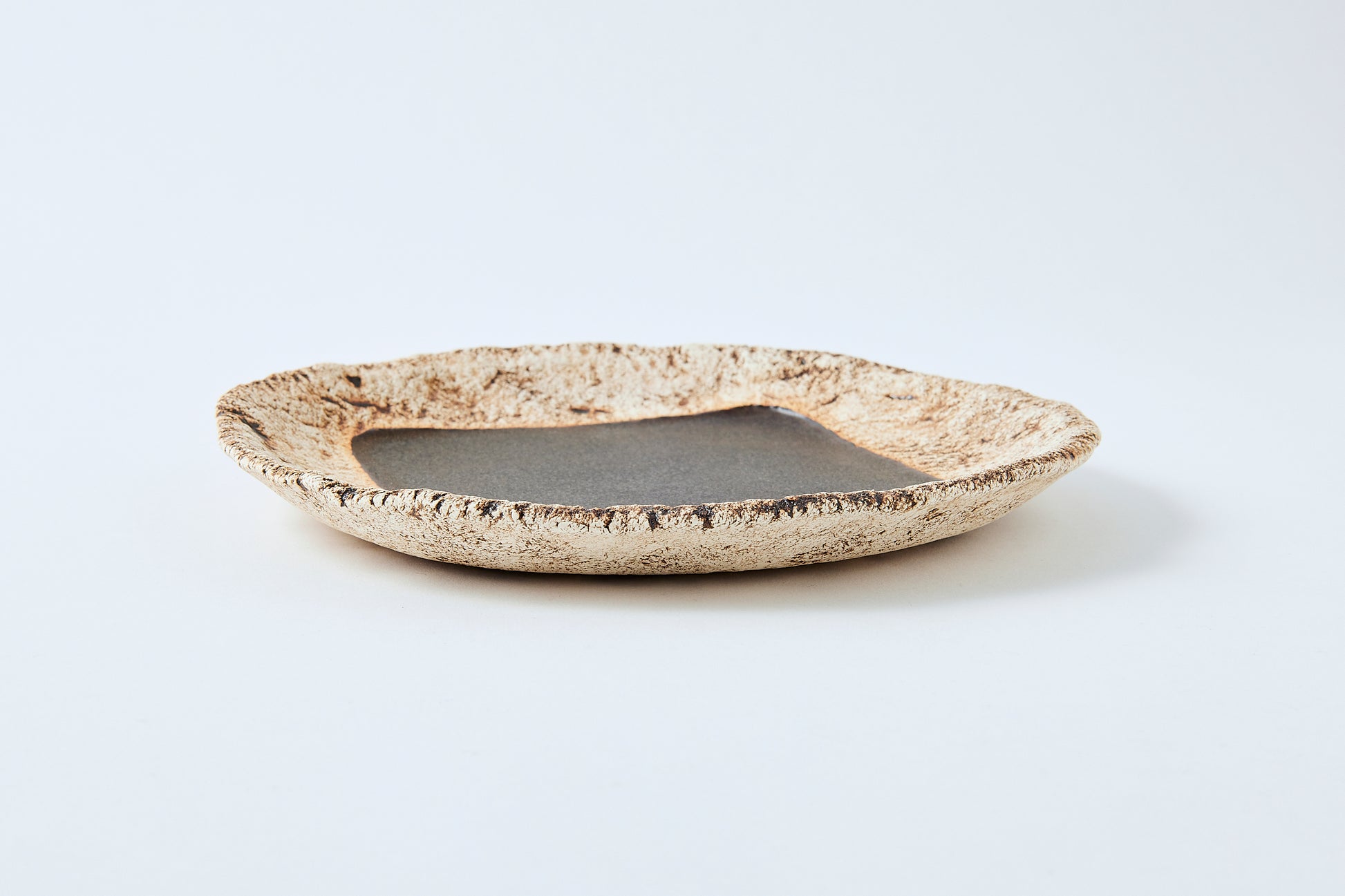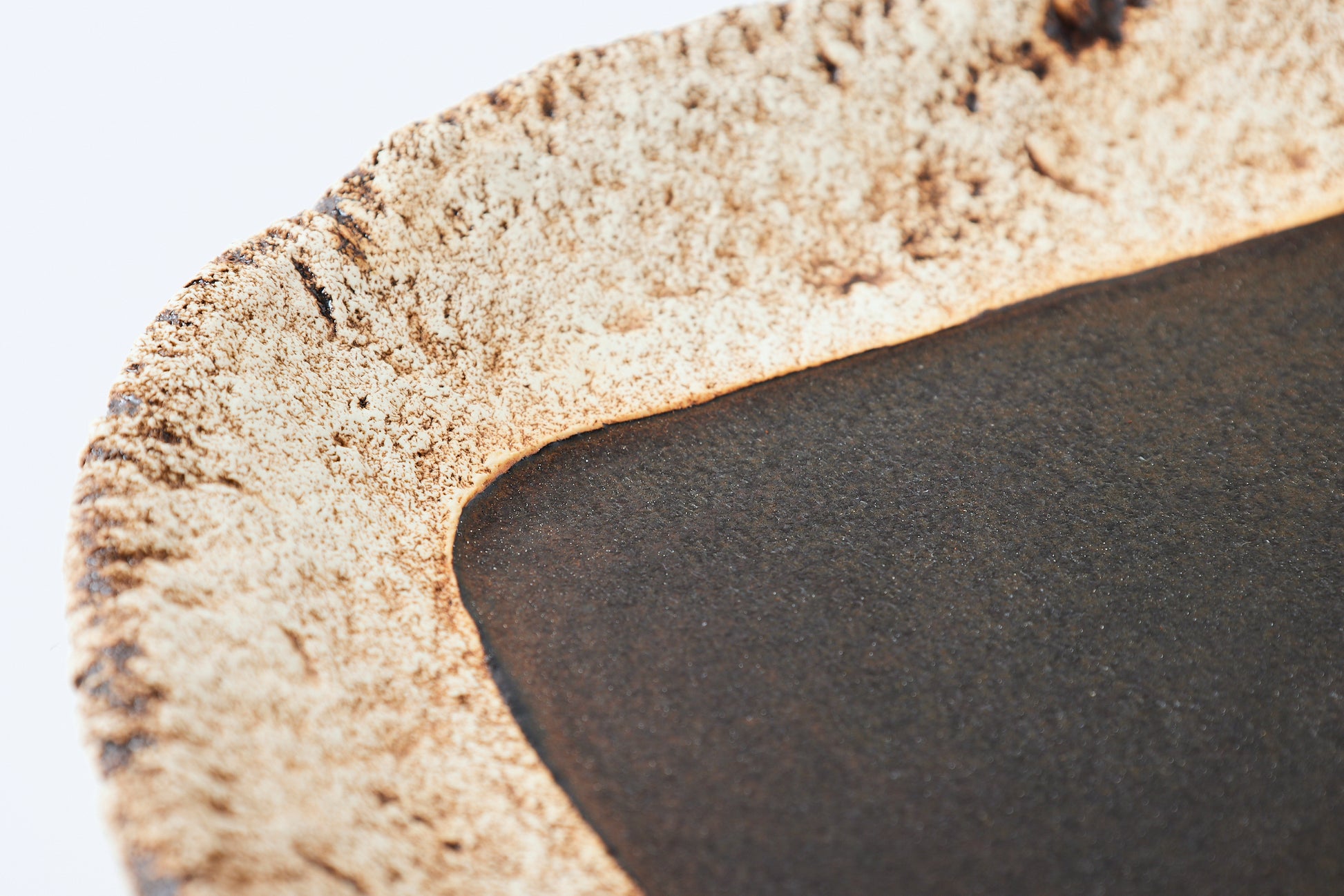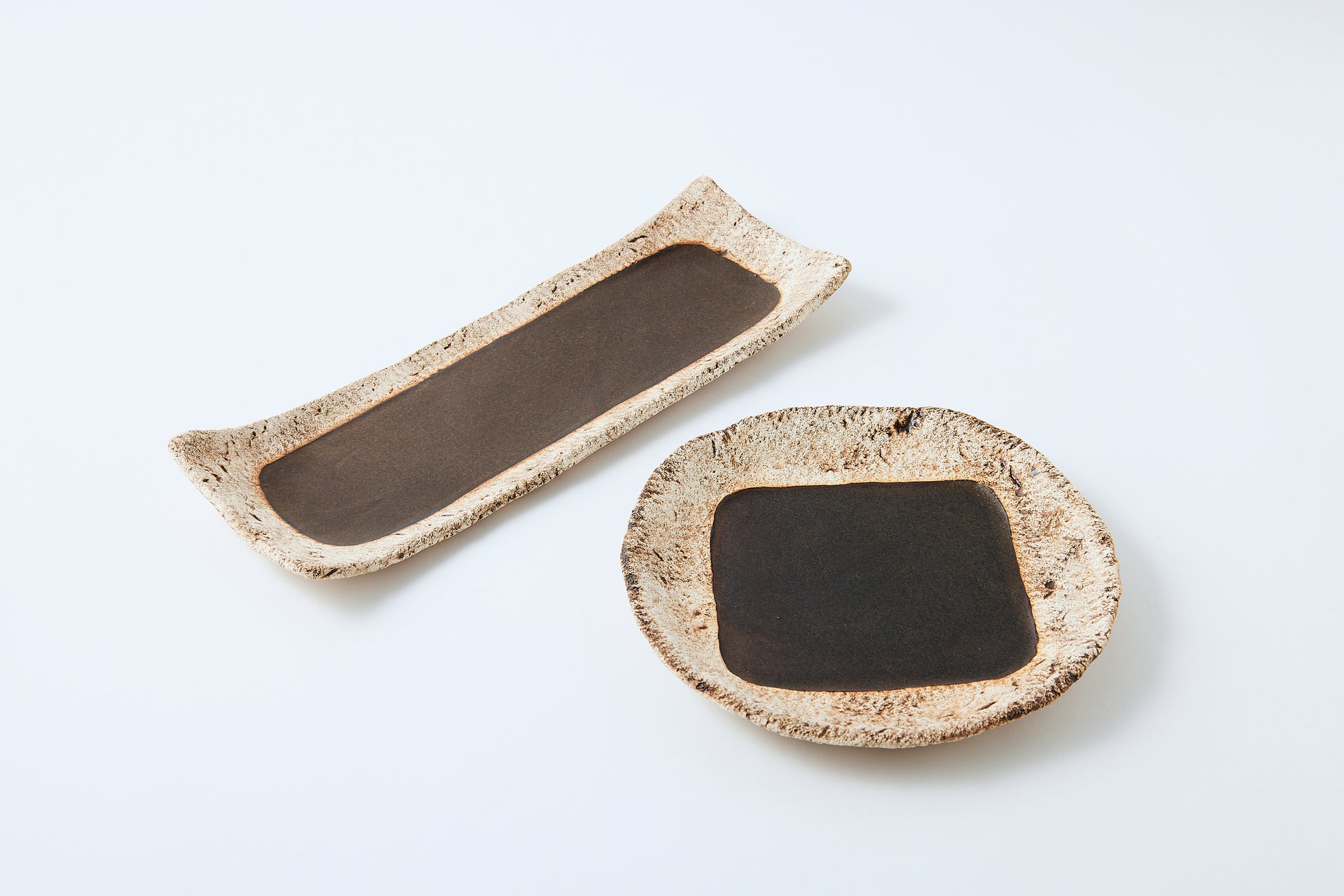 The works are characterized by rock-like surfaces and monotone colors. The material is semi-porcelain (a mix of clay and porcelain).It looks like a rock and feels heavy, but when you actually hold it, it is light and strong.