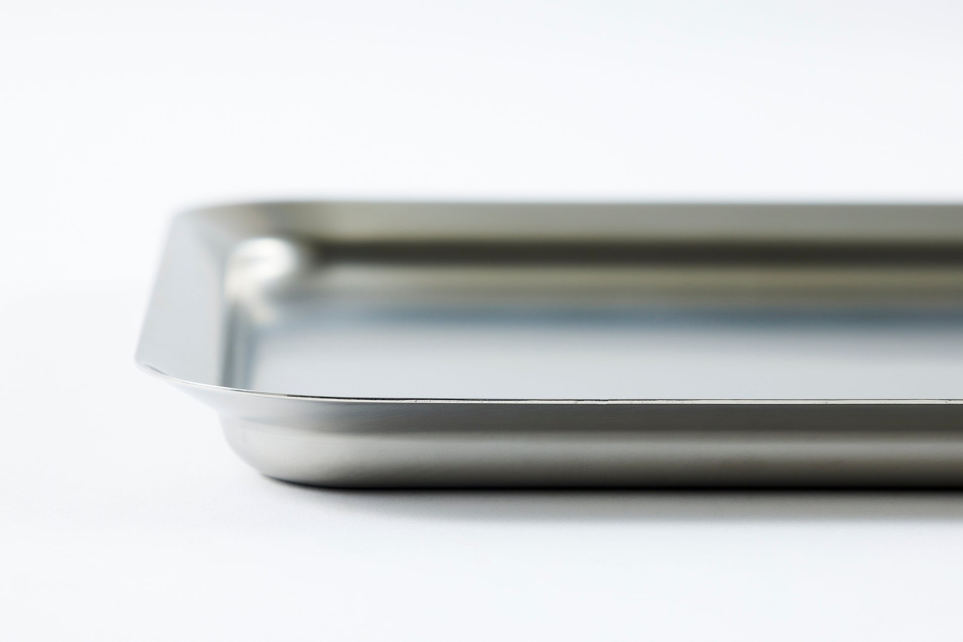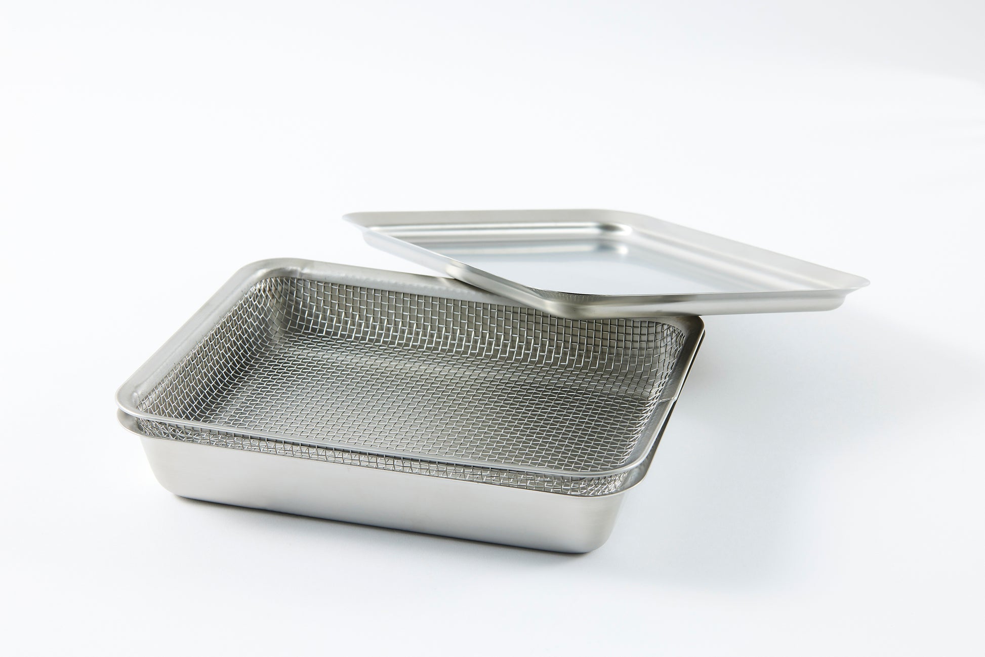 This multi-purpose plate serves as a lid for a rectangular prep tray or as a drip tray beneath a mesh strainer.