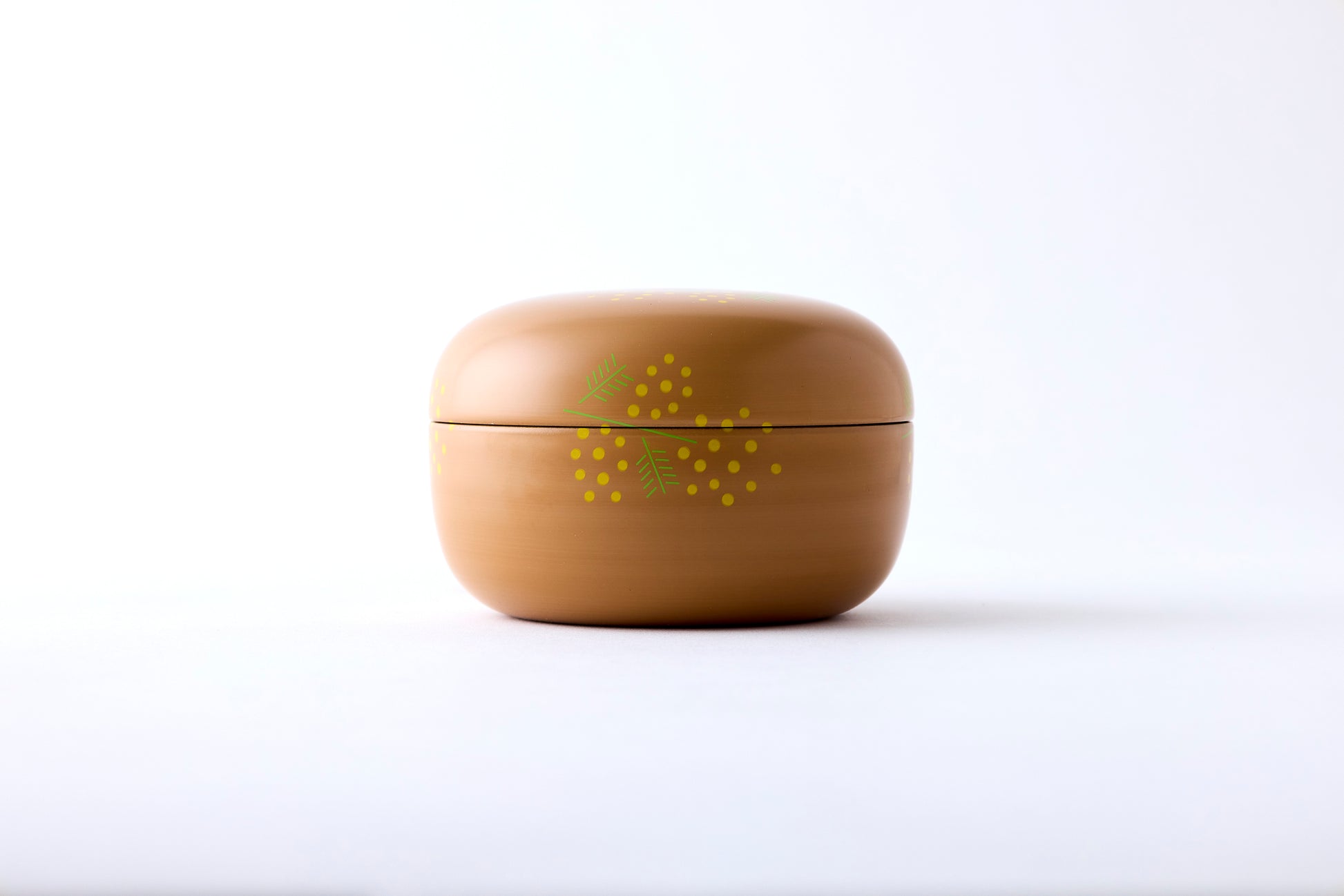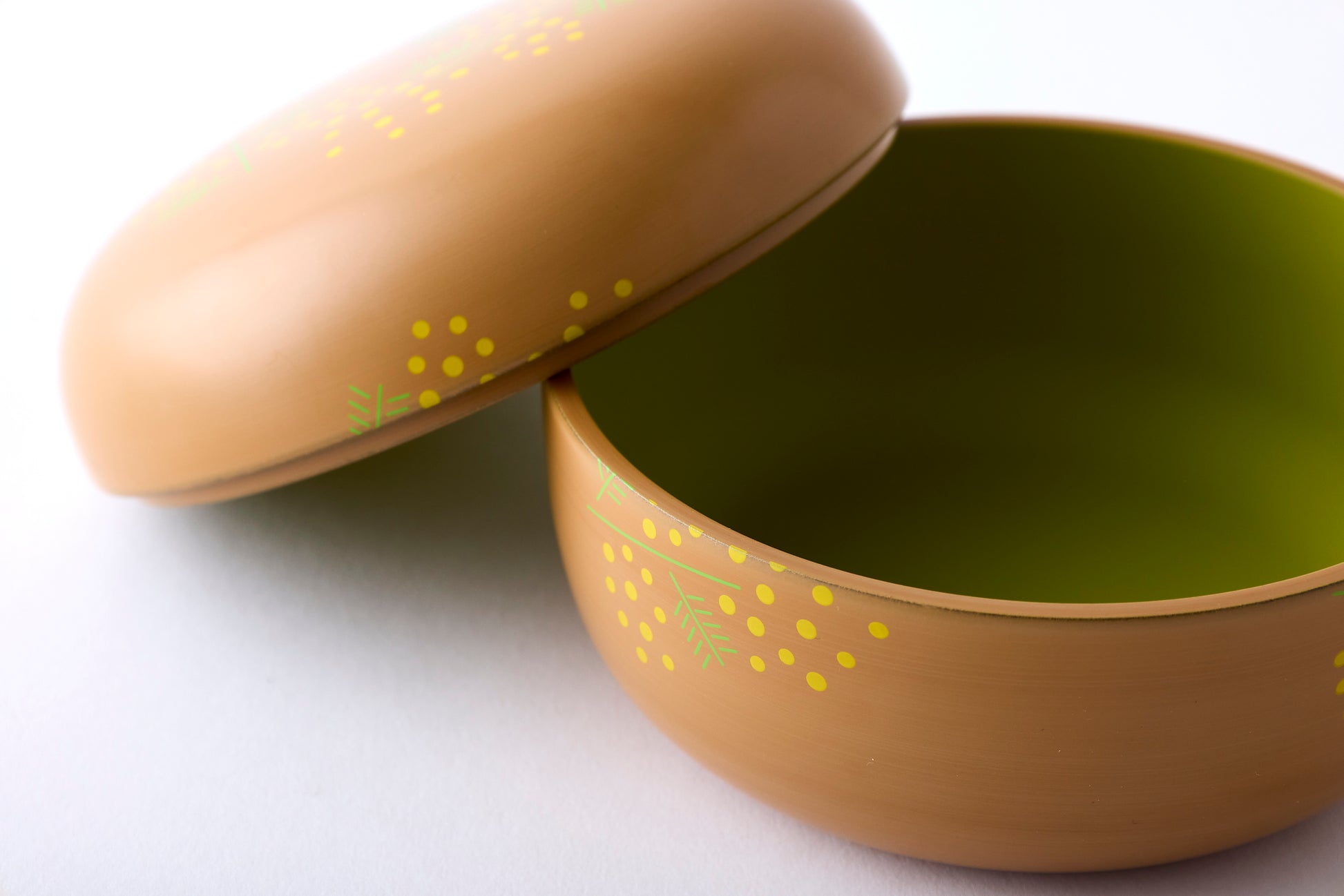 This is a large-sized bonbonnière (candy box) from the "MIMOSA" series, created with the desire to propose new lacquerware suitable for heartfelt gifts.