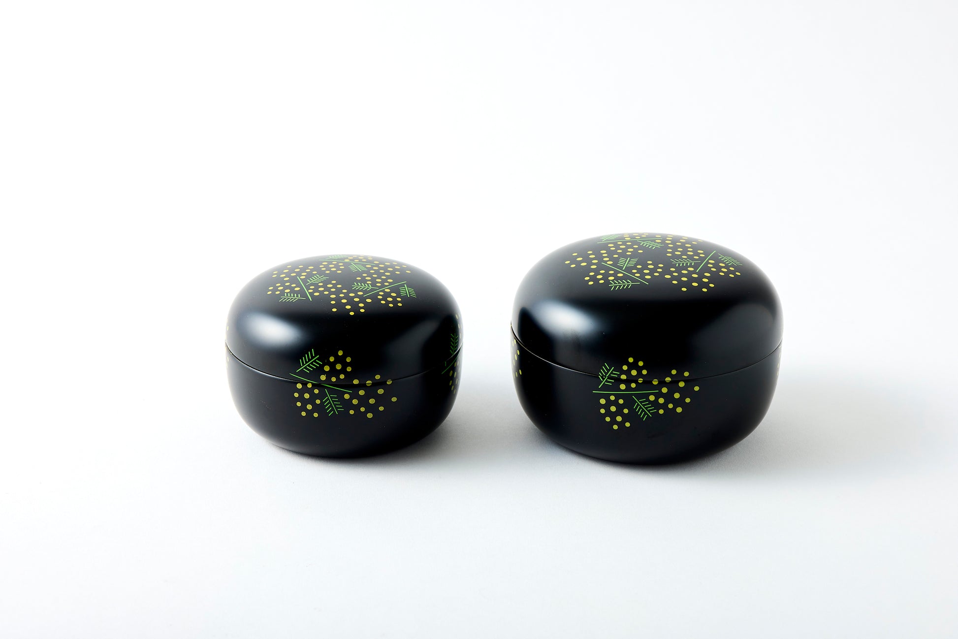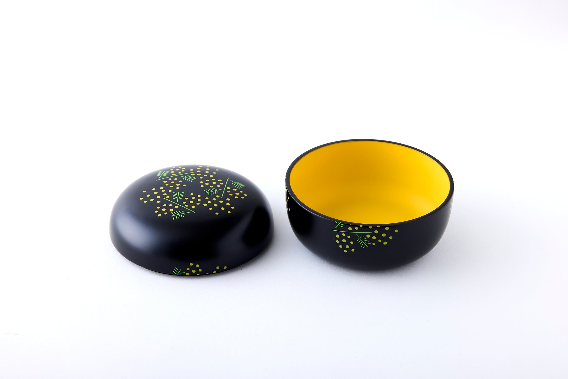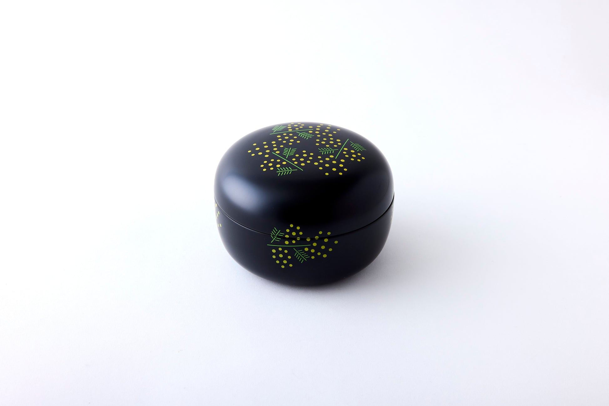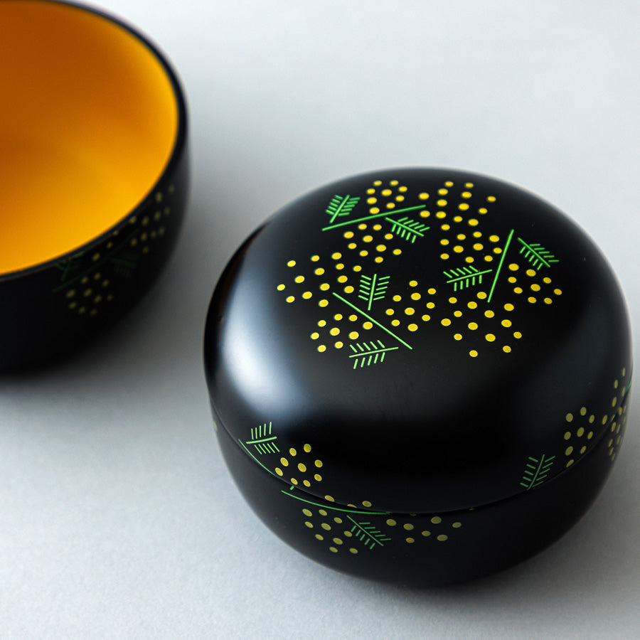 The base colors are black and white lacquer. Mimosa patterns are applied not only on the lid but also on the sides, allowing you to enjoy the contrast between the lacquer and the mimosa design.