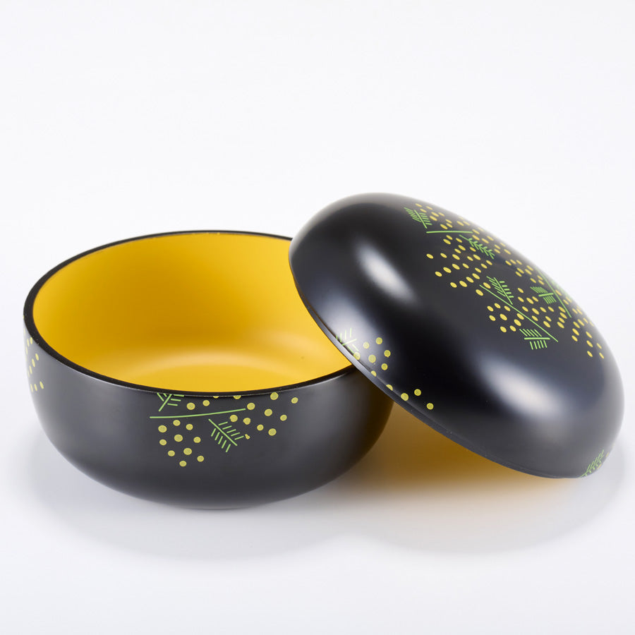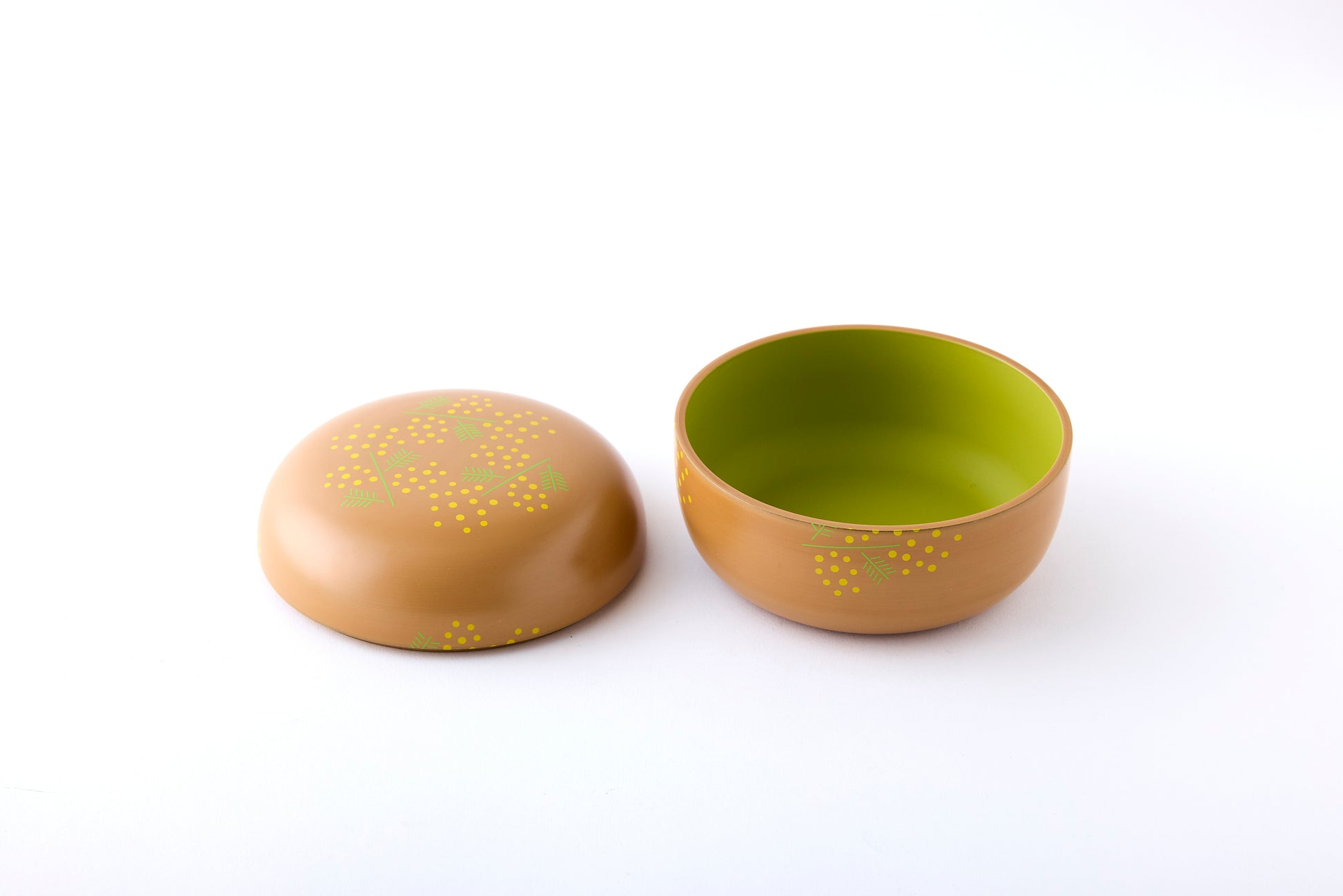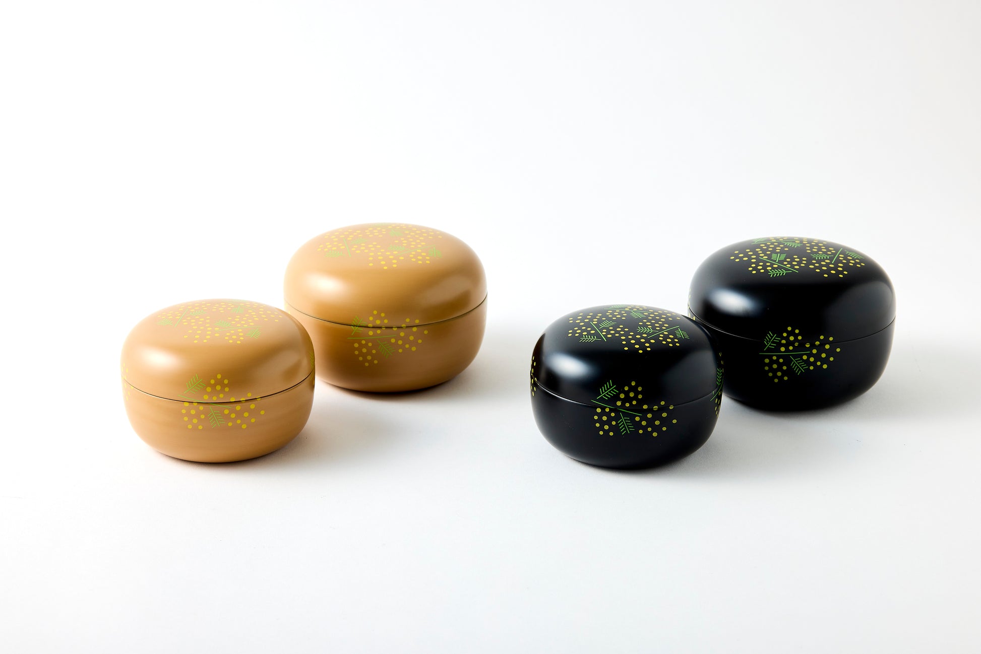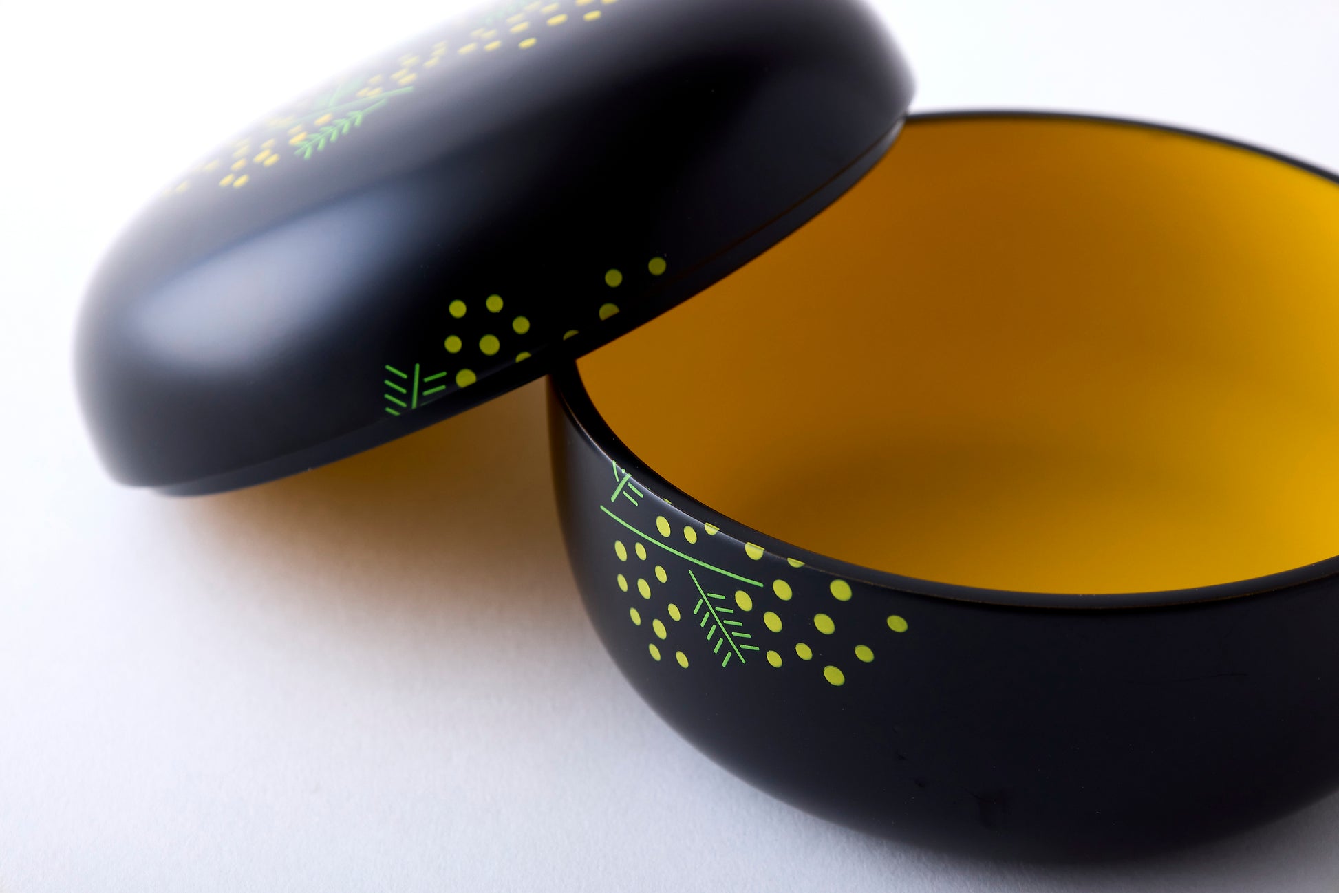 The base colors are black and white lacquer. Mimosa patterns are applied not only on the lid but also on the sides, allowing you to enjoy the contrast between the lacquer and the mimosa design.