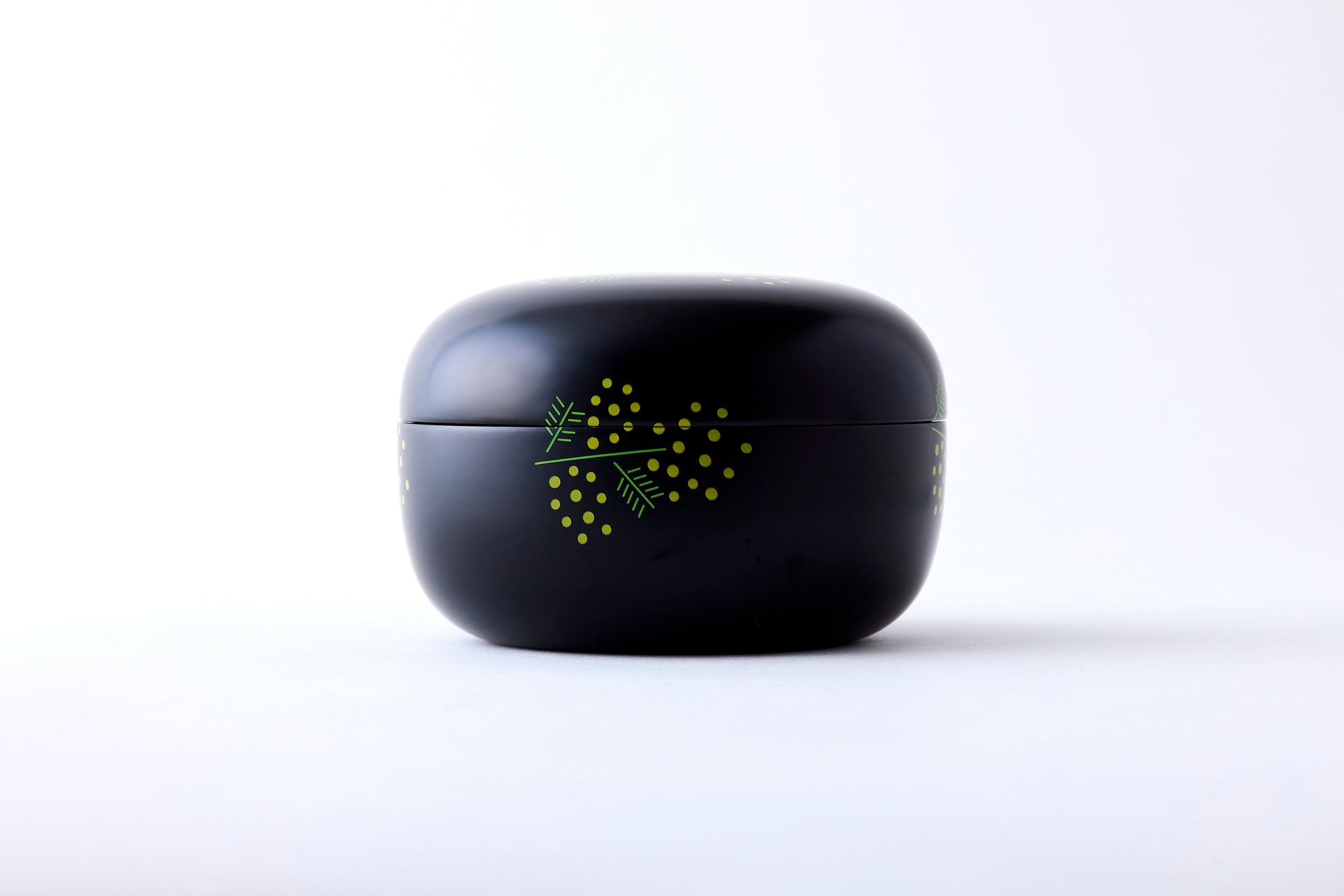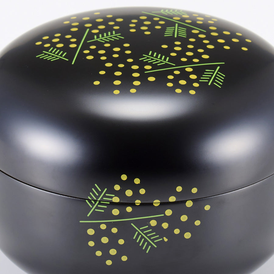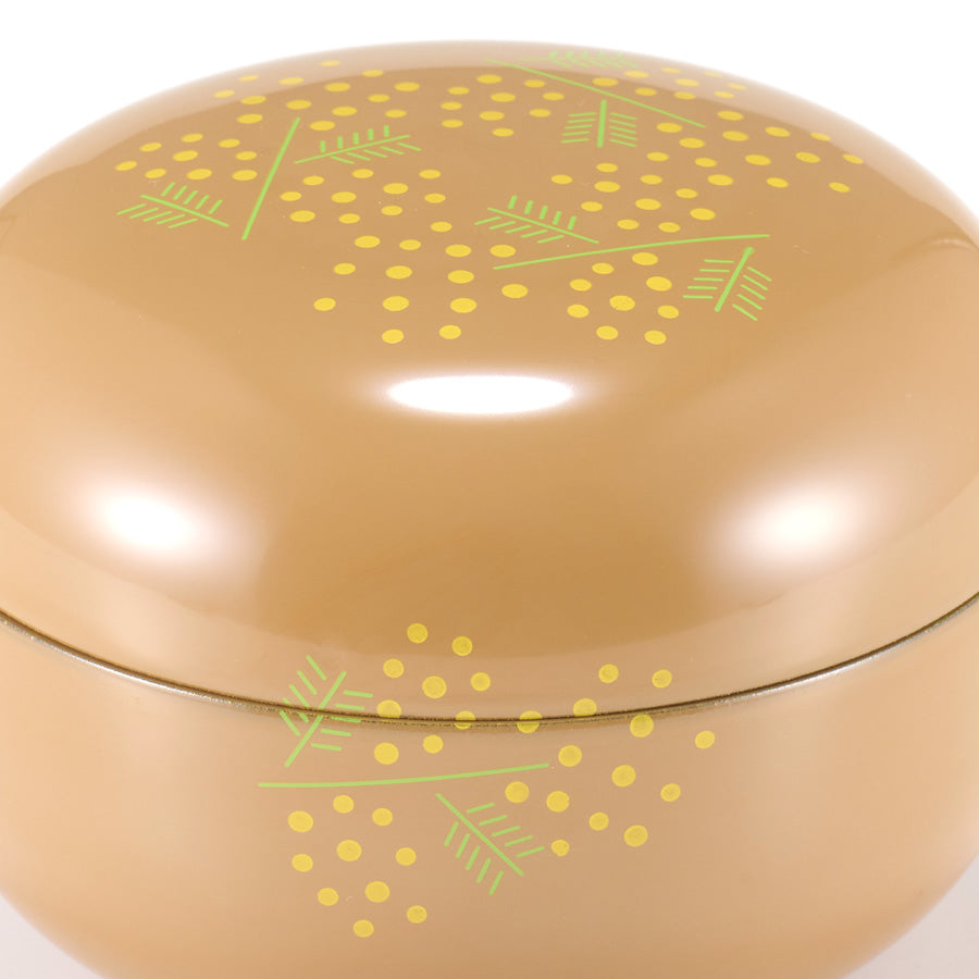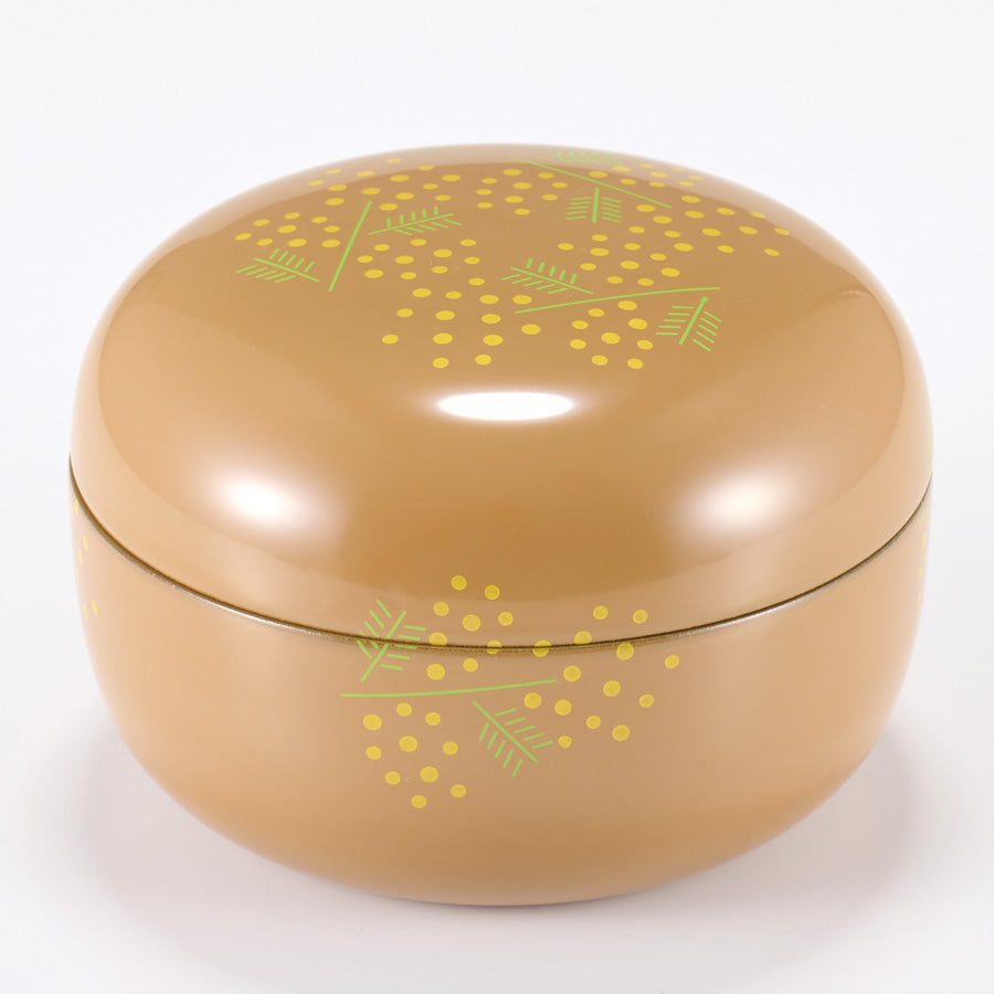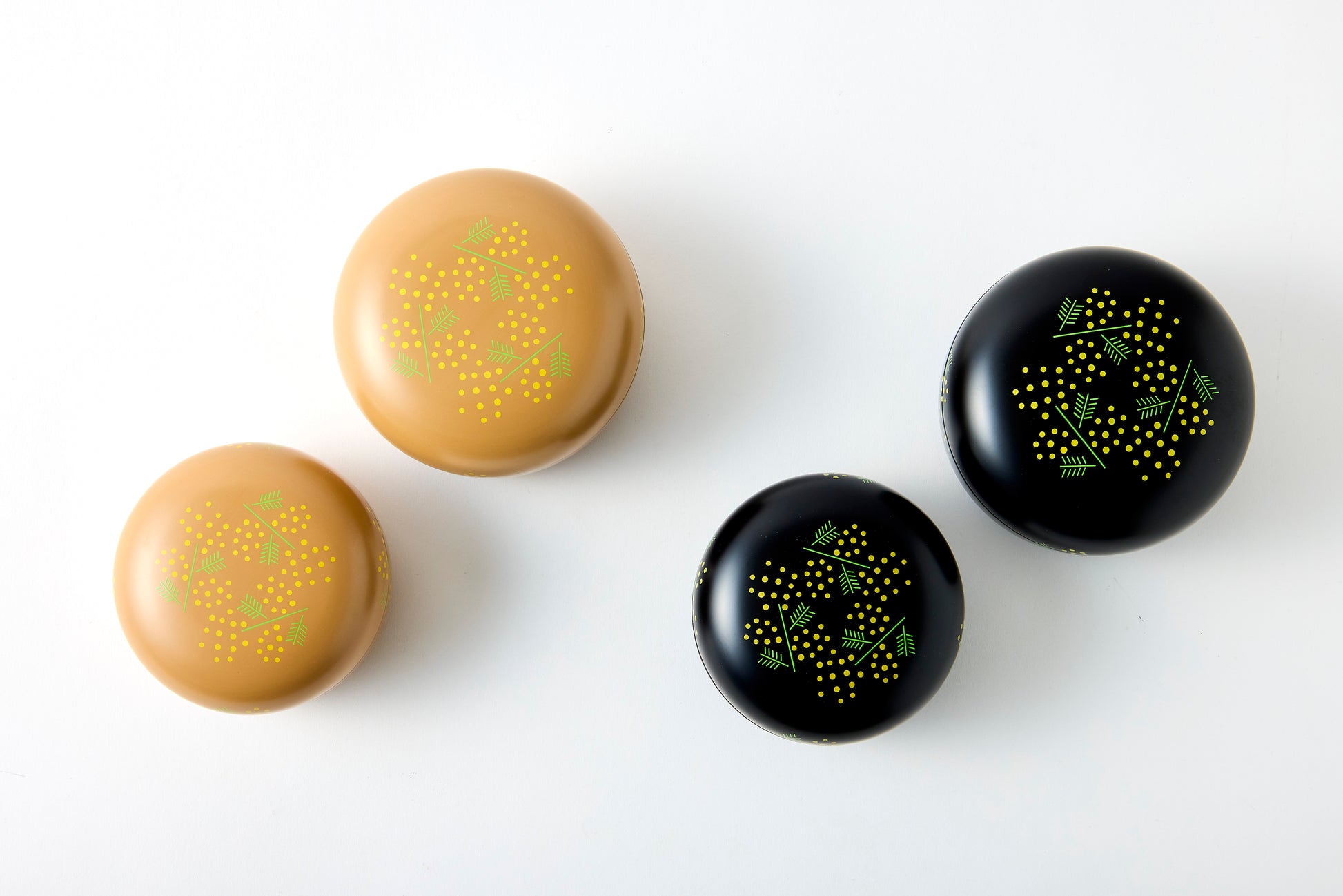 The base colors are black and white lacquer. Mimosa patterns are applied not only on the lid but also on the sides, allowing you to enjoy the contrast between the lacquer and the mimosa design.