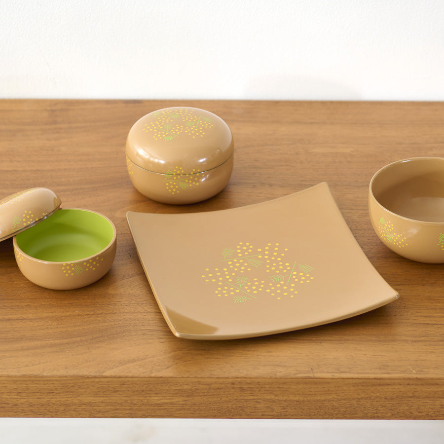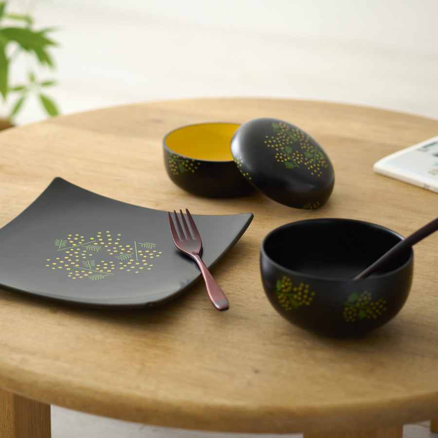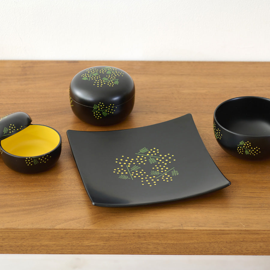 The design motif features mimosa flowers, a rare choice for lacquerware. These mimosa flowers are designed in a simple and modern pattern, adorably painted over black or white lacquer.