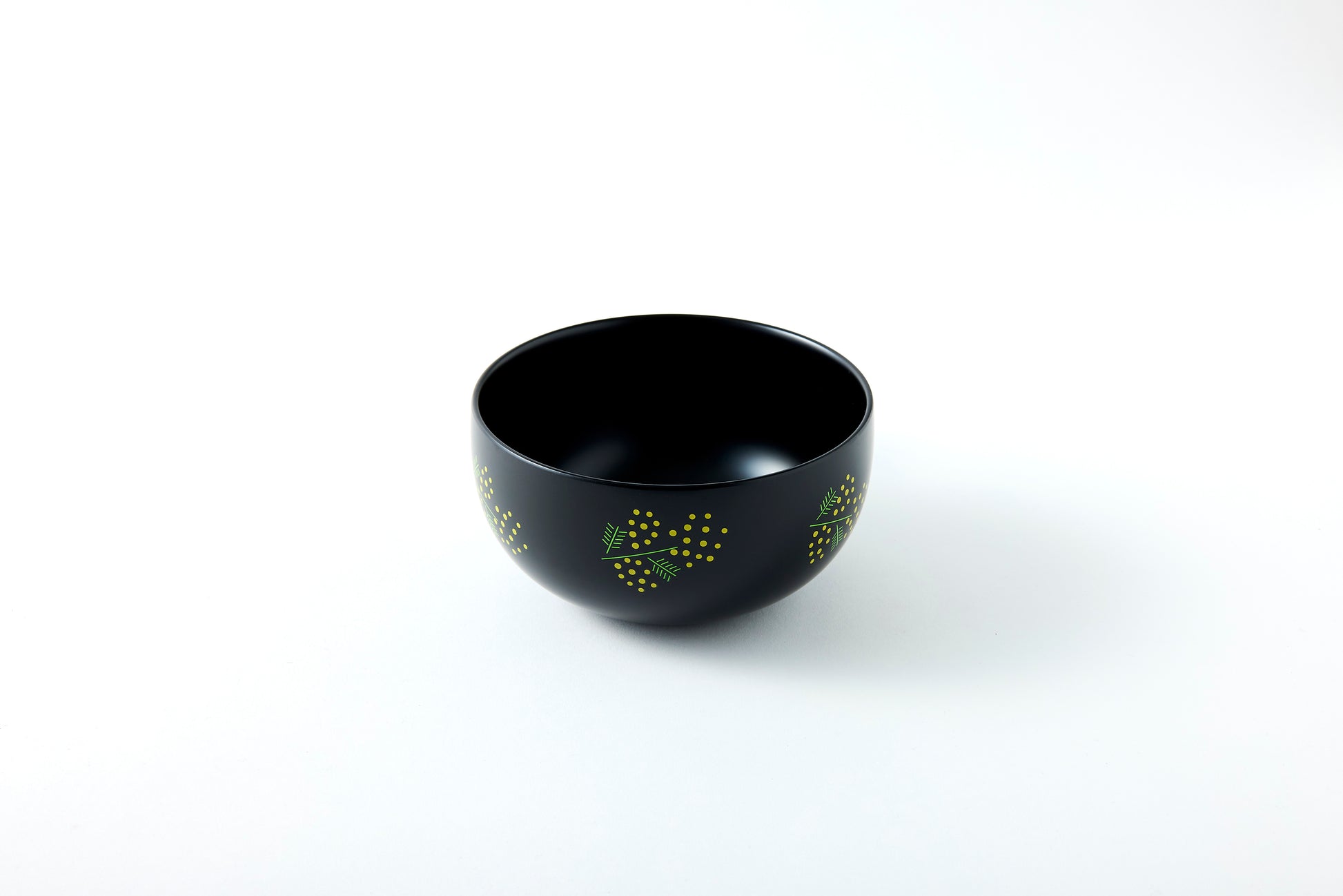 The design motif features mimosa flowers, a rare choice for lacquerware. These mimosa flowers are designed in a simple and modern pattern, adorably painted over black or white lacquer.