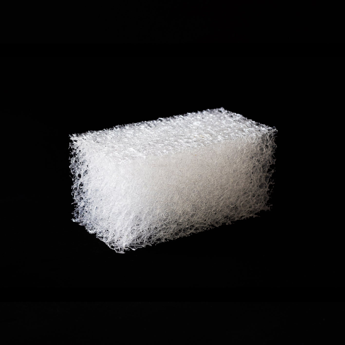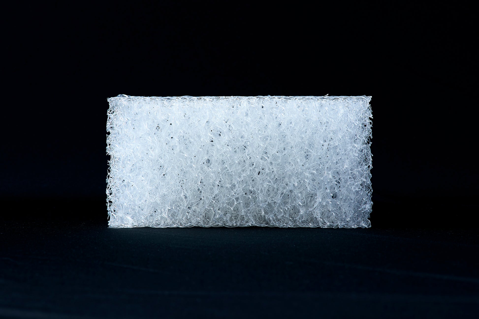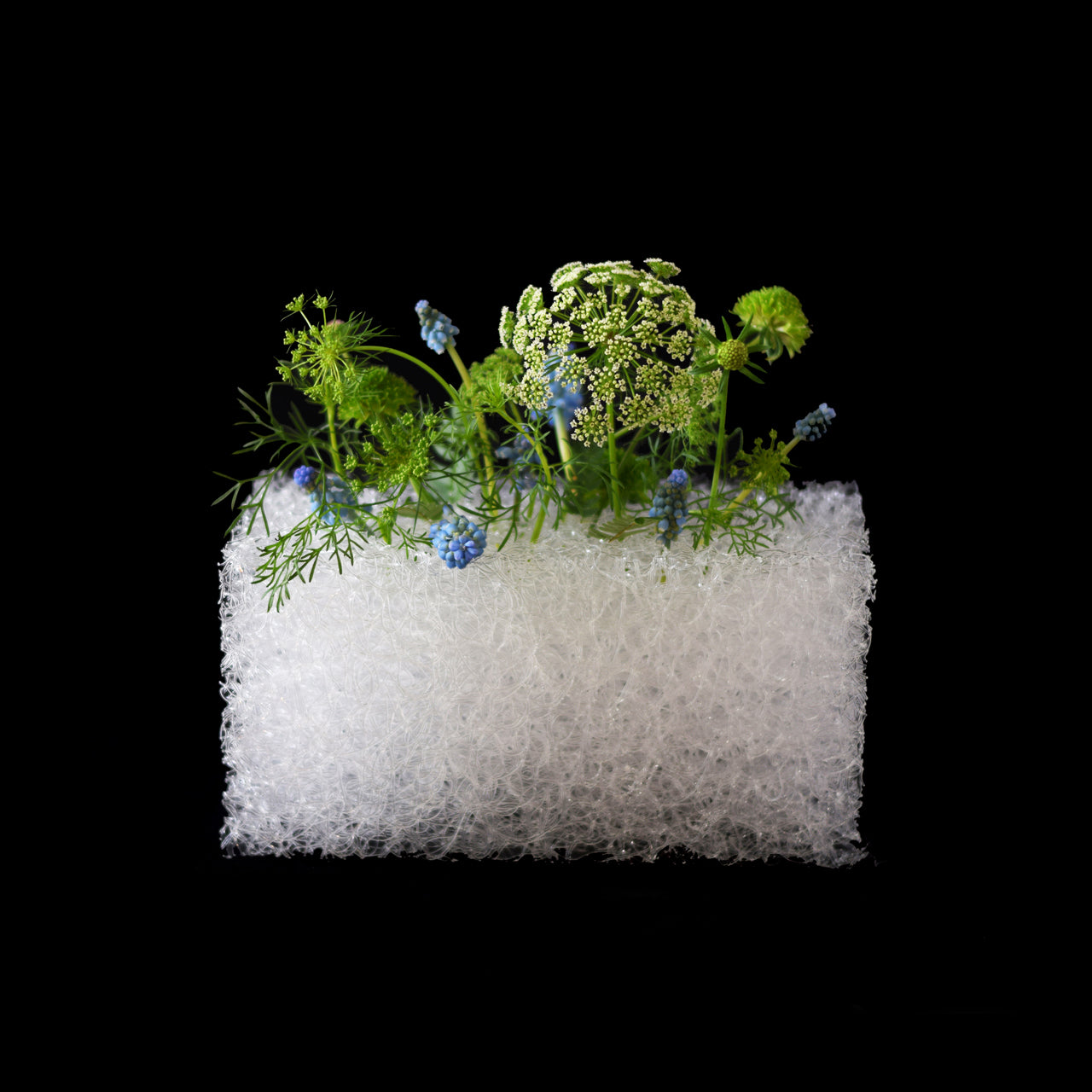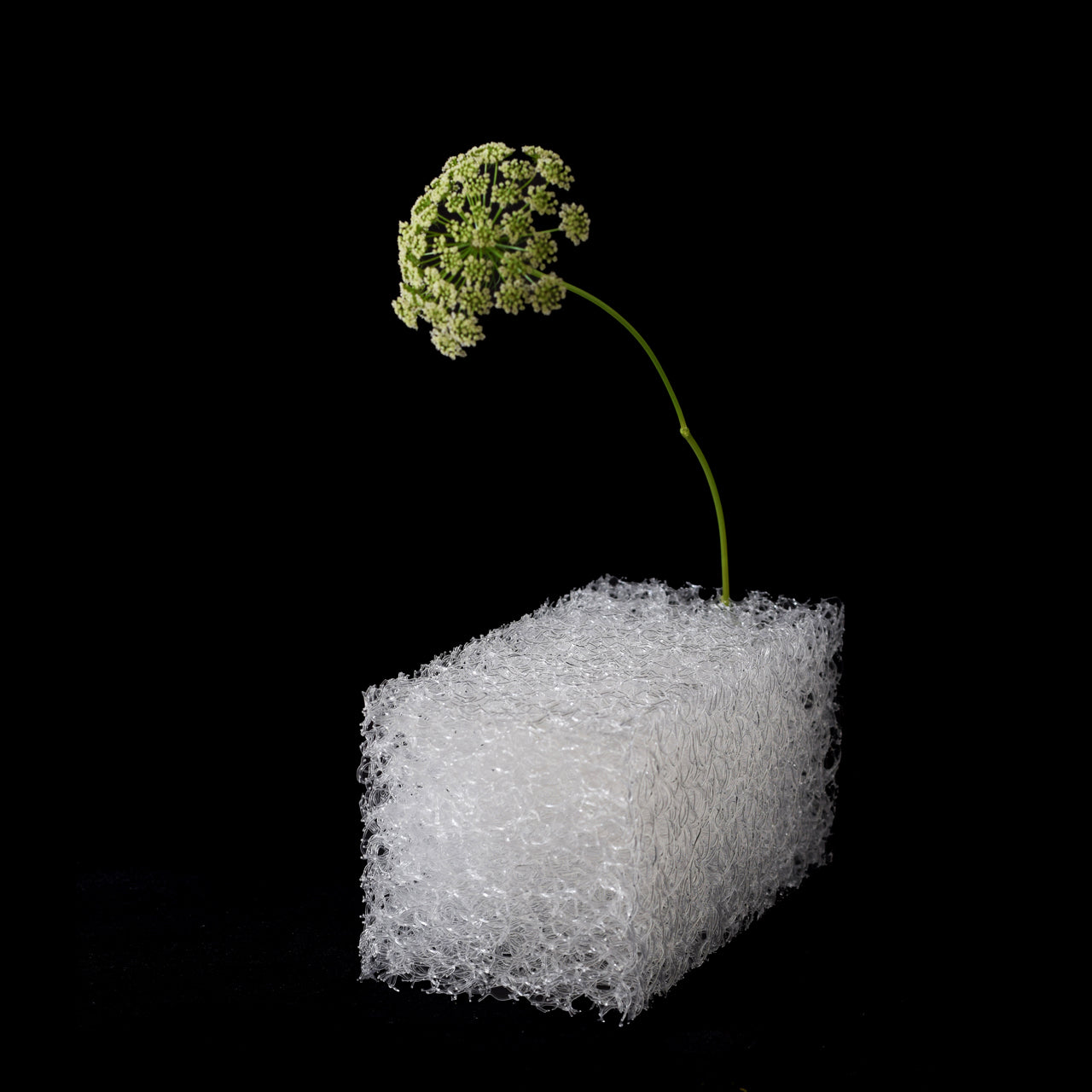 A cube-shaped floral base made of polyethylene and other resins, designed with a mesh-like structure.