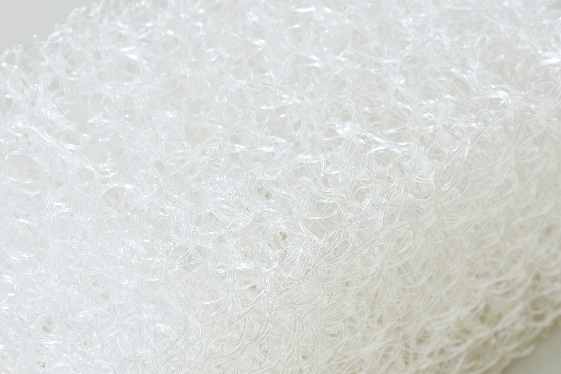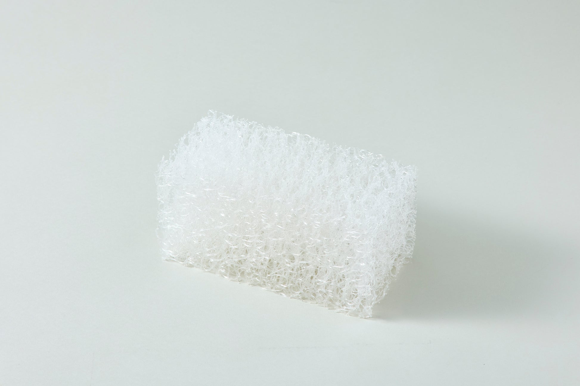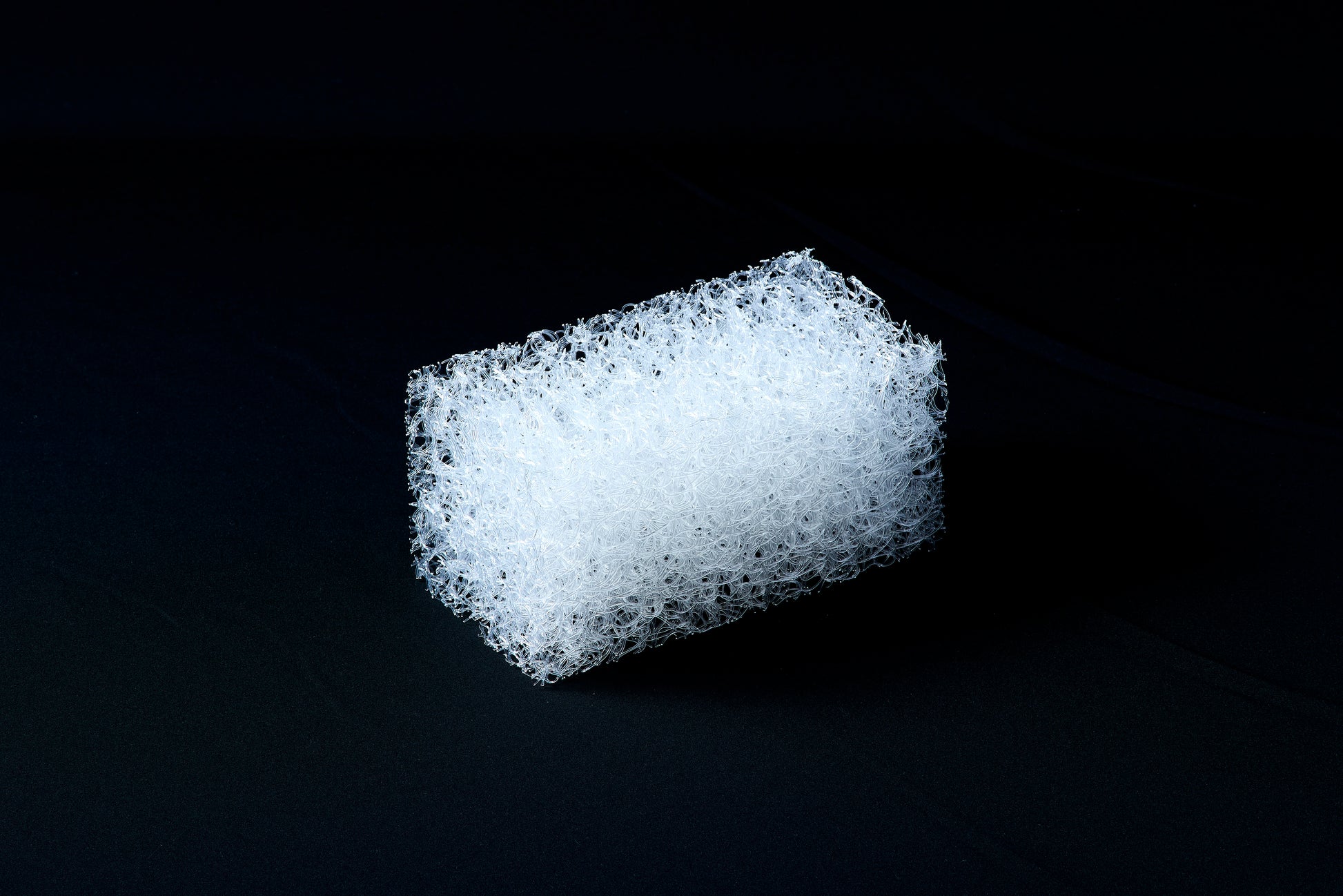 A cube-shaped floral base made of polyethylene and other resins, designed with a mesh-like structure.