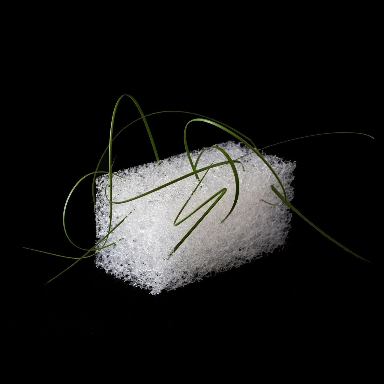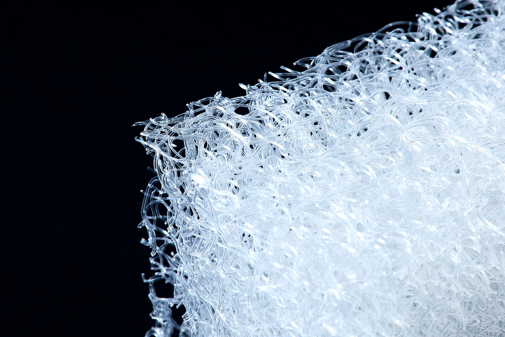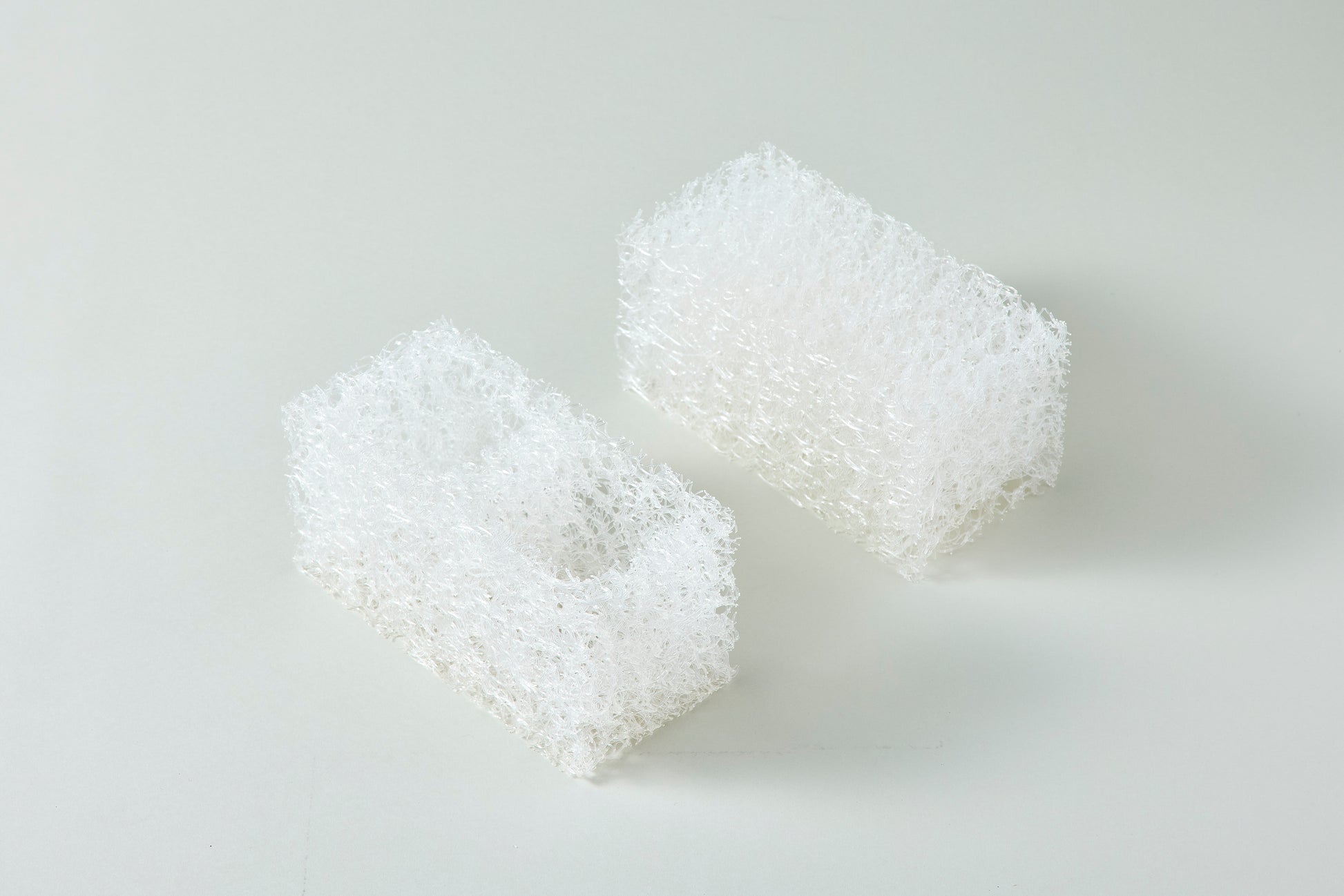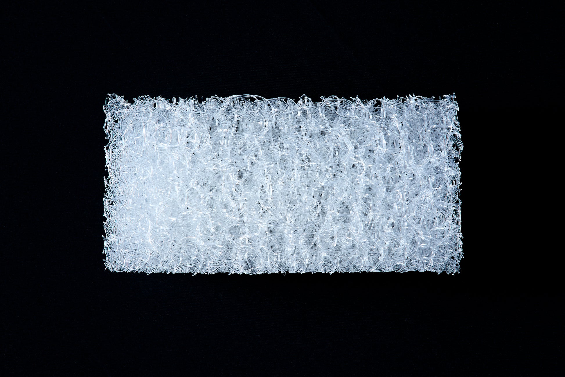 A cube-shaped floral base made of polyethylene and other resins, designed with a mesh-like structure.