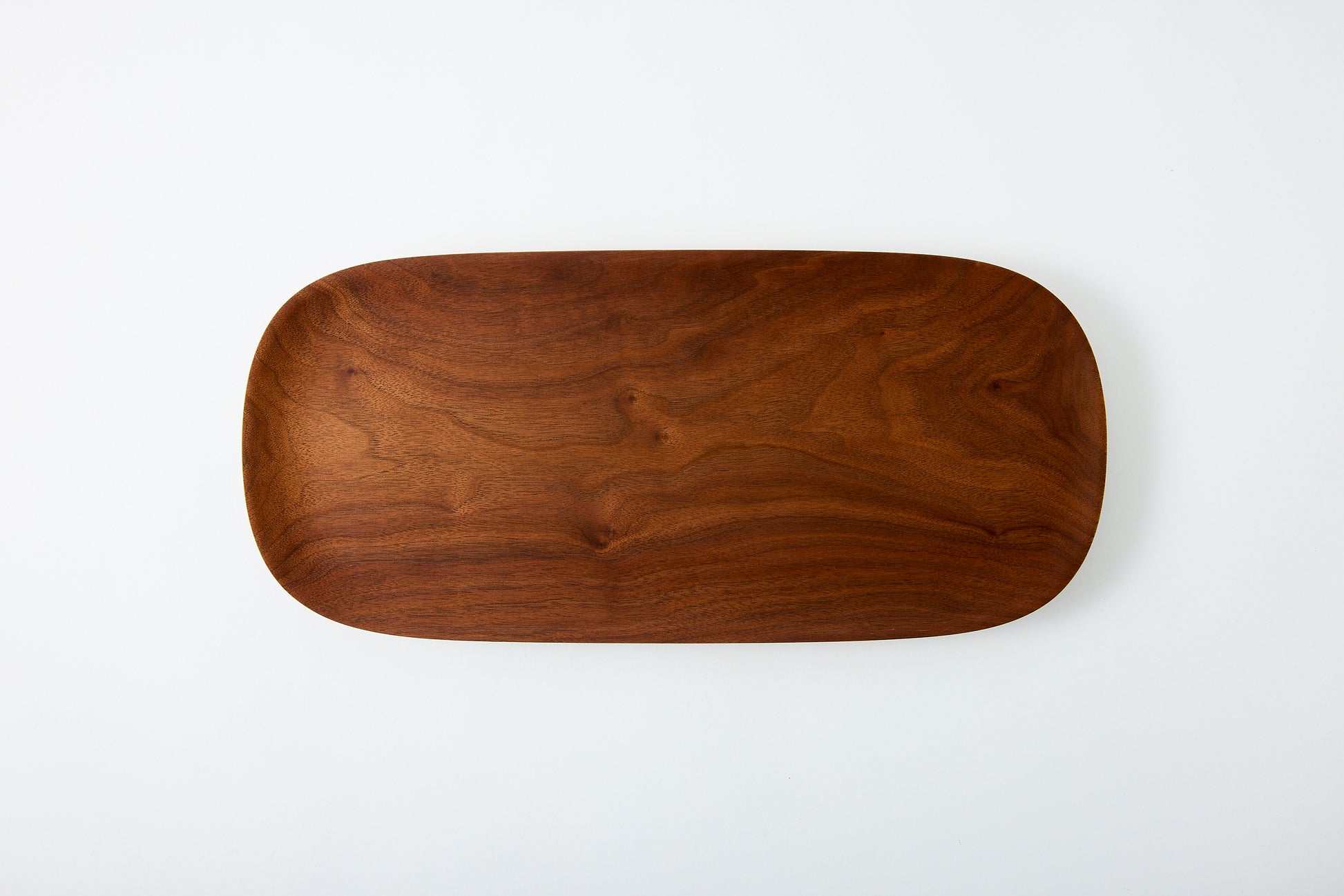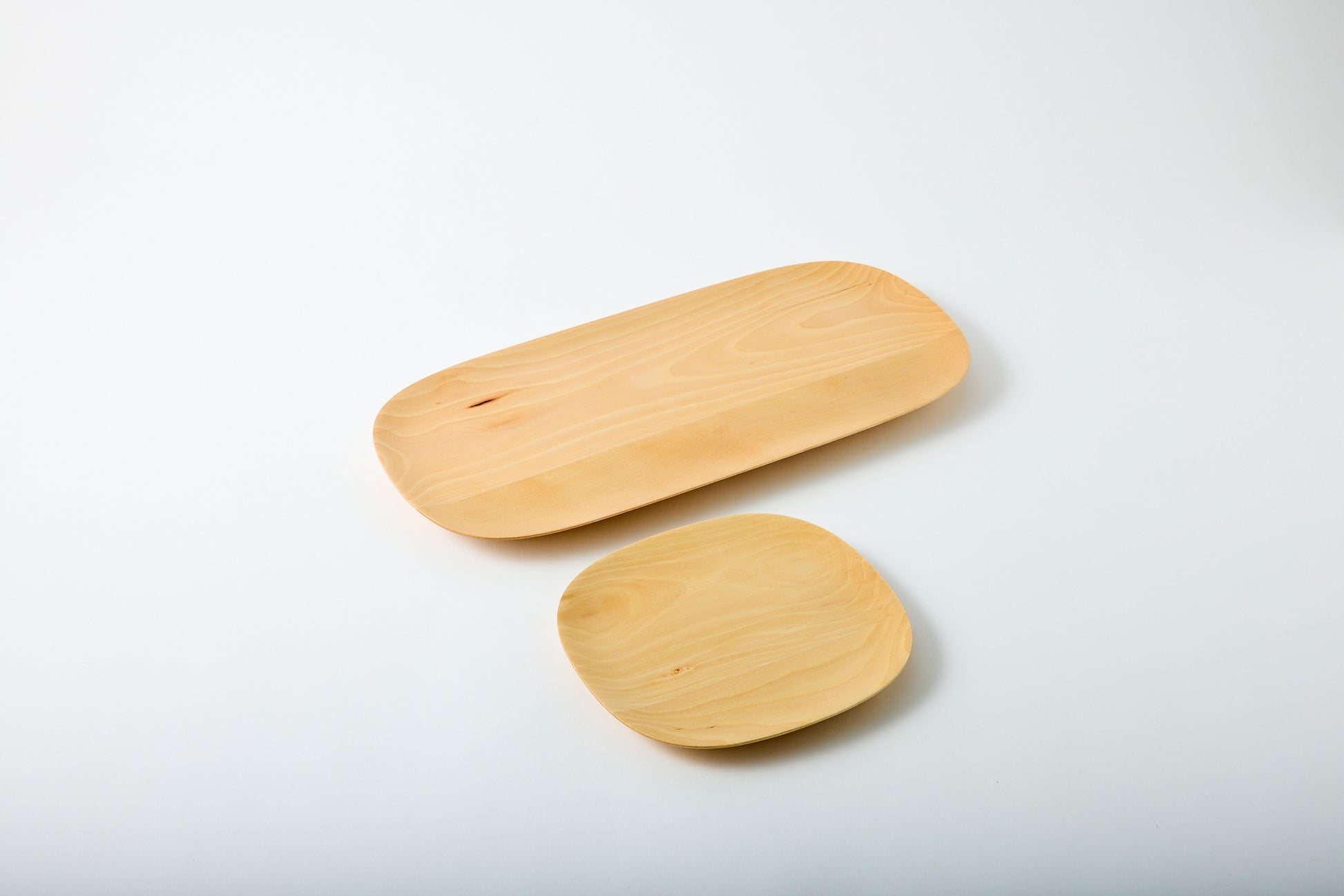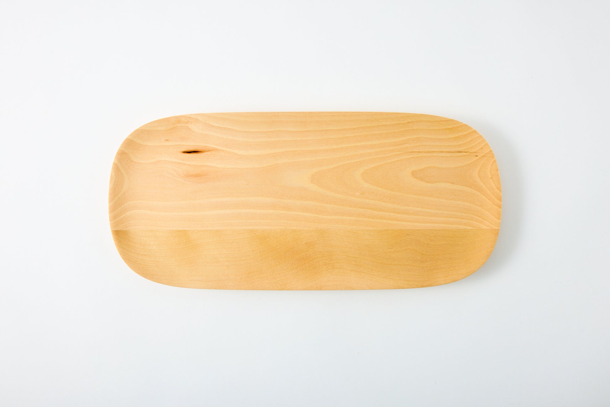 A plate that showcases wood grain resembling a ridgeline. Available in two types: a wide size convenient for small arrangements or entertaining, and a regular size that fits perfectly for one slice of toast. The regular size can be placed side by side to match the wide size, allowing for a cohesive styling on the table. Despite its simple shape, it features the beauty of the wood grain and a satisfying weight when held. A meticulously crafted piece precisely because of its plain design.