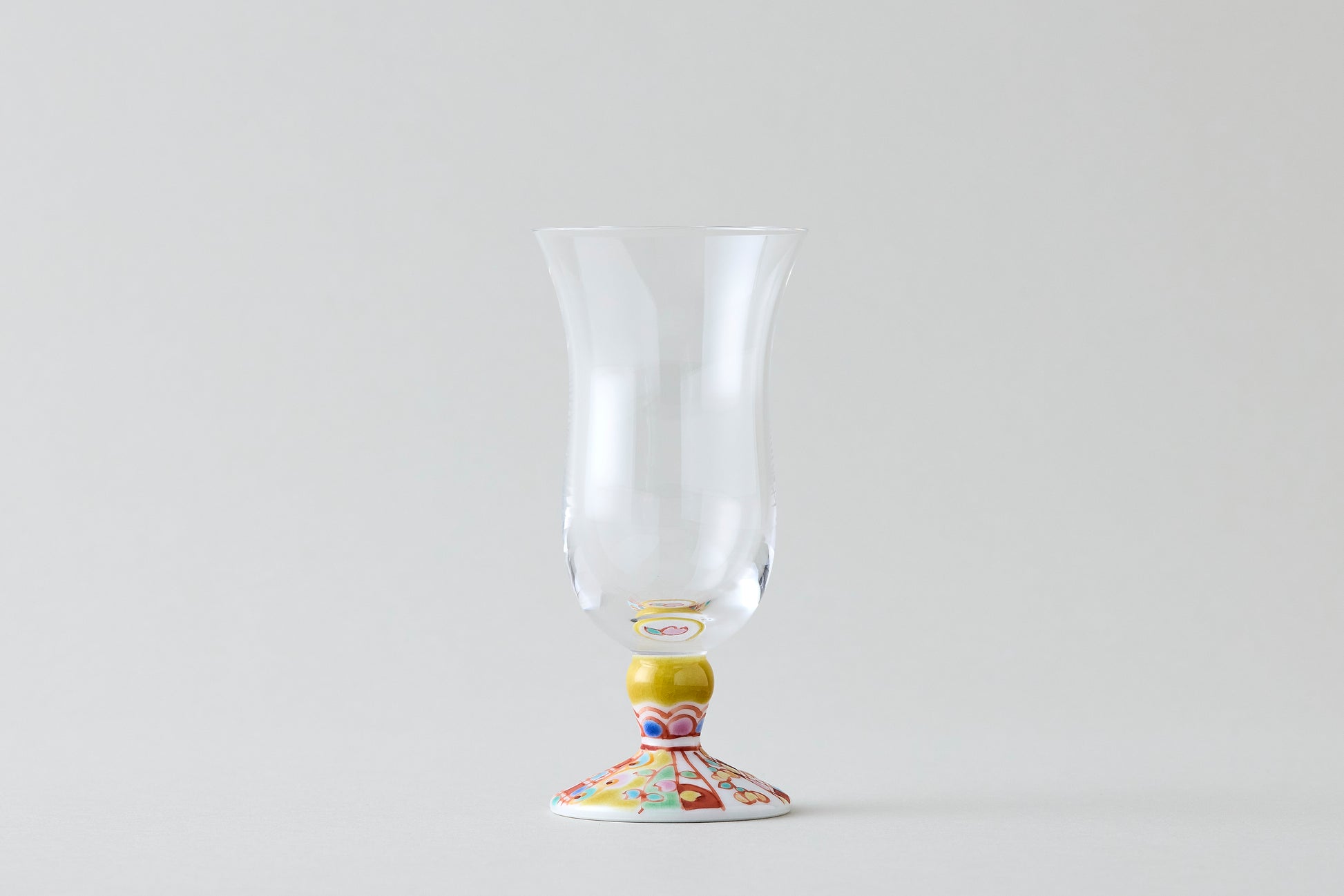 This is a cold sake glass from the "Kutani Wa Glass" series, created by fusing Kutani porcelain and handmade blown glass.