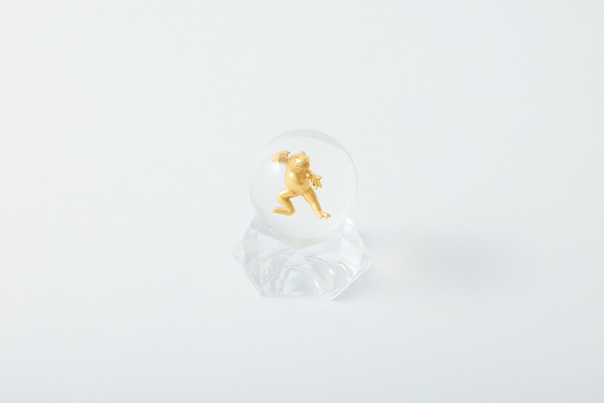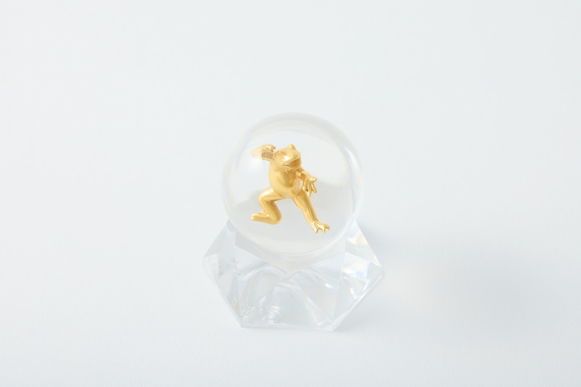 At the heart of the piece is a golden frog motif, crafted in 18k gold, inspired by the famous Chōjū-jinbutsu-giga (Scrolls of Frolicking Animals and Humans), a national treasure preserved at Kōzan-ji Temple in Kyoto. The featured frog, shown sumo wrestling with a rabbit in the scroll’s most well-known scene, embodies playfulness and vitality.