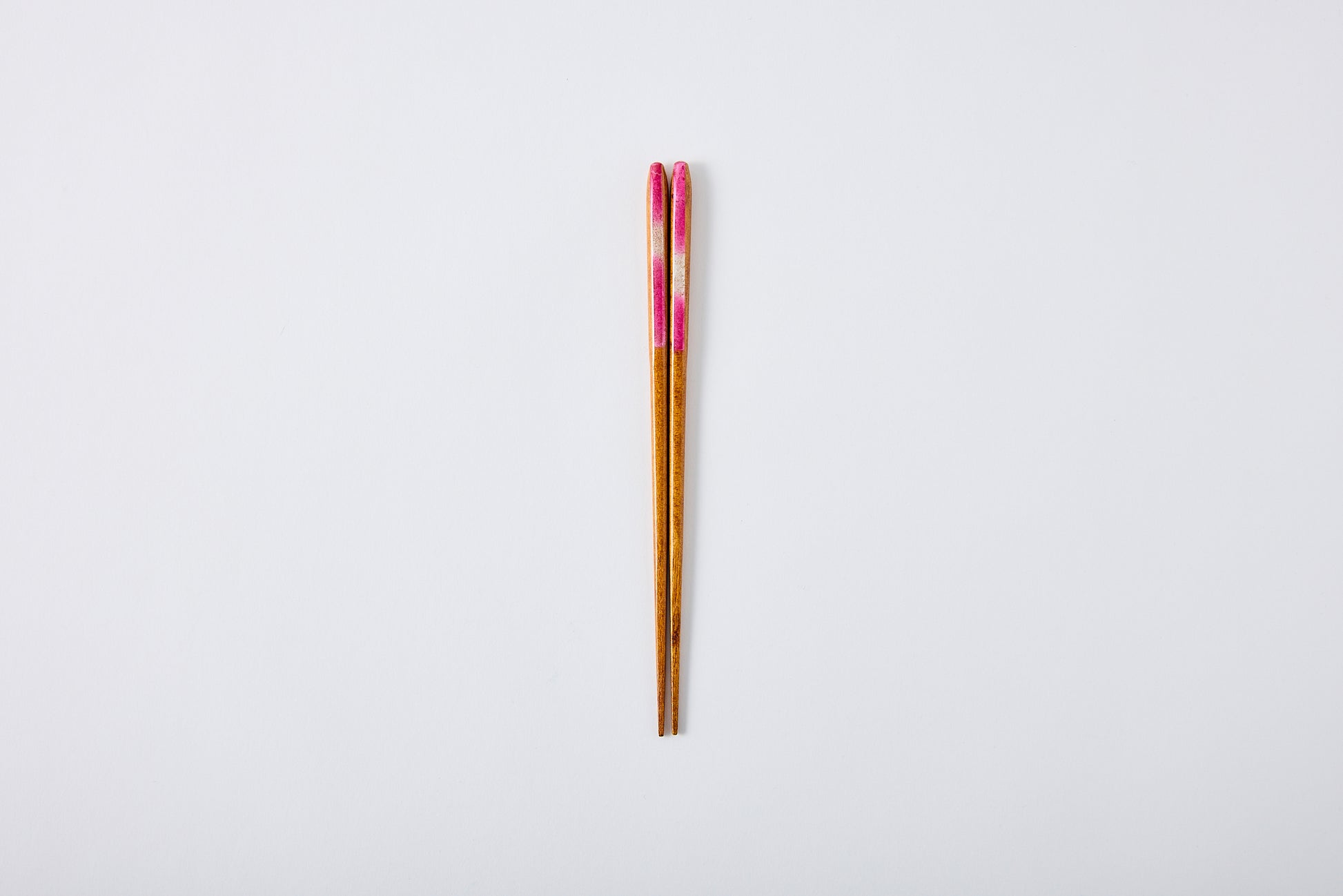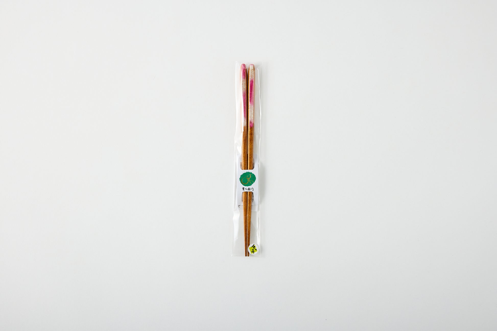 Chopsticks wrapped in washi paper dyed with a mottled pink pattern on a white base.
