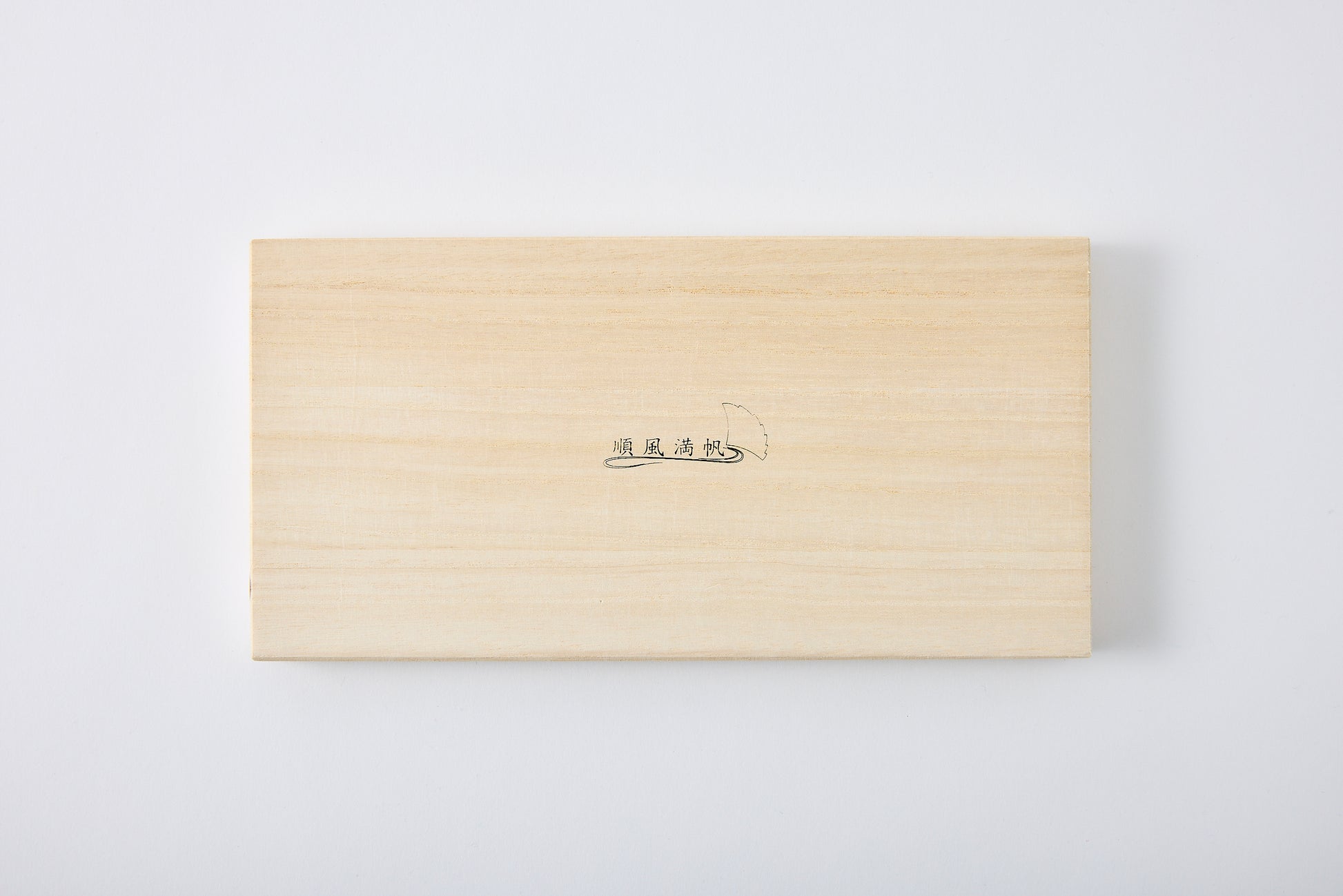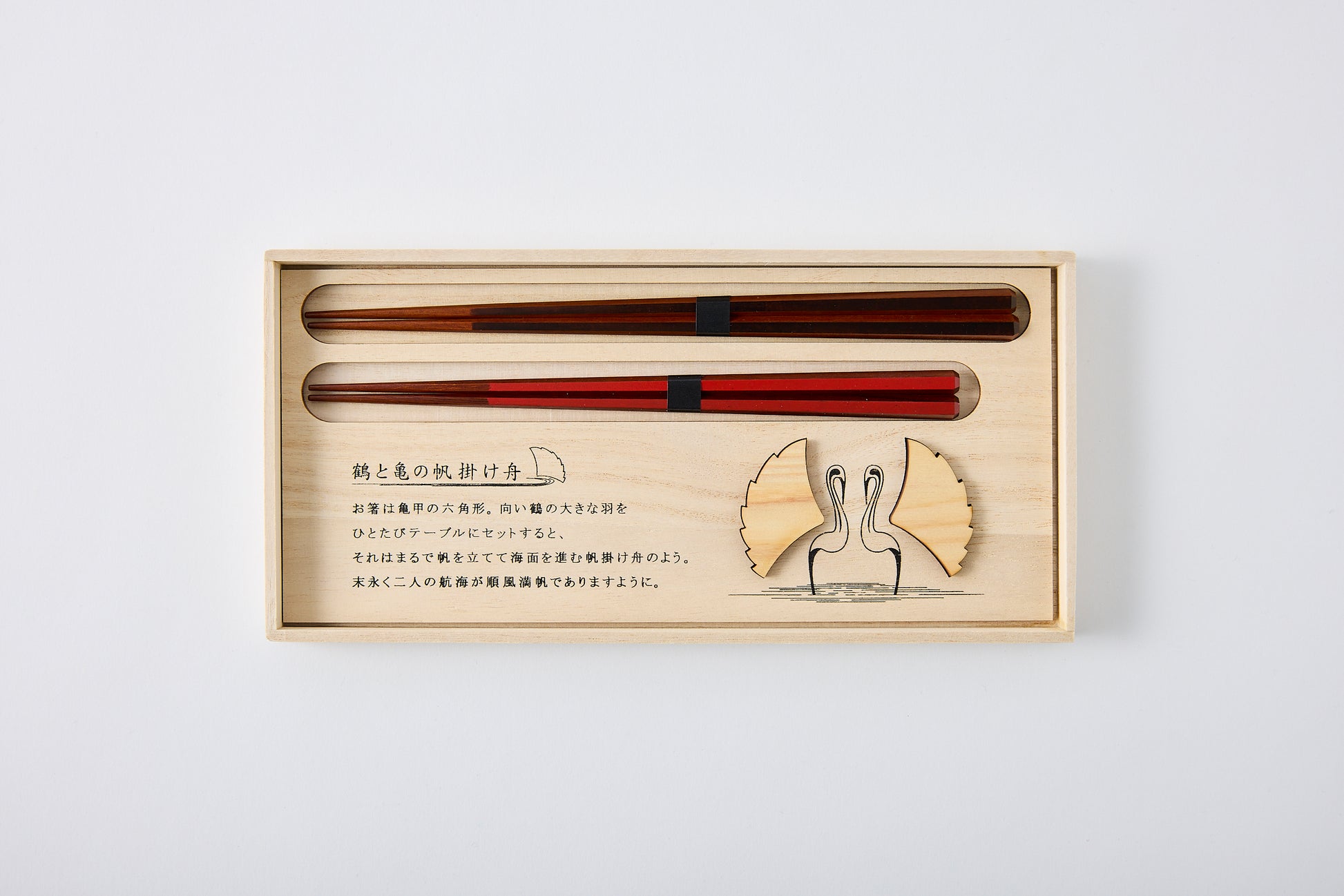 Once you set the large wings of the facing cranes (chopstick rests) on the table, it resembles a scallop boat sailing across the sea with raised sails. Hoping for a lifetime of smooth sailing for the two of you, this special set includes chopsticks and chopstick rests encased in a custom-made paulownia box.